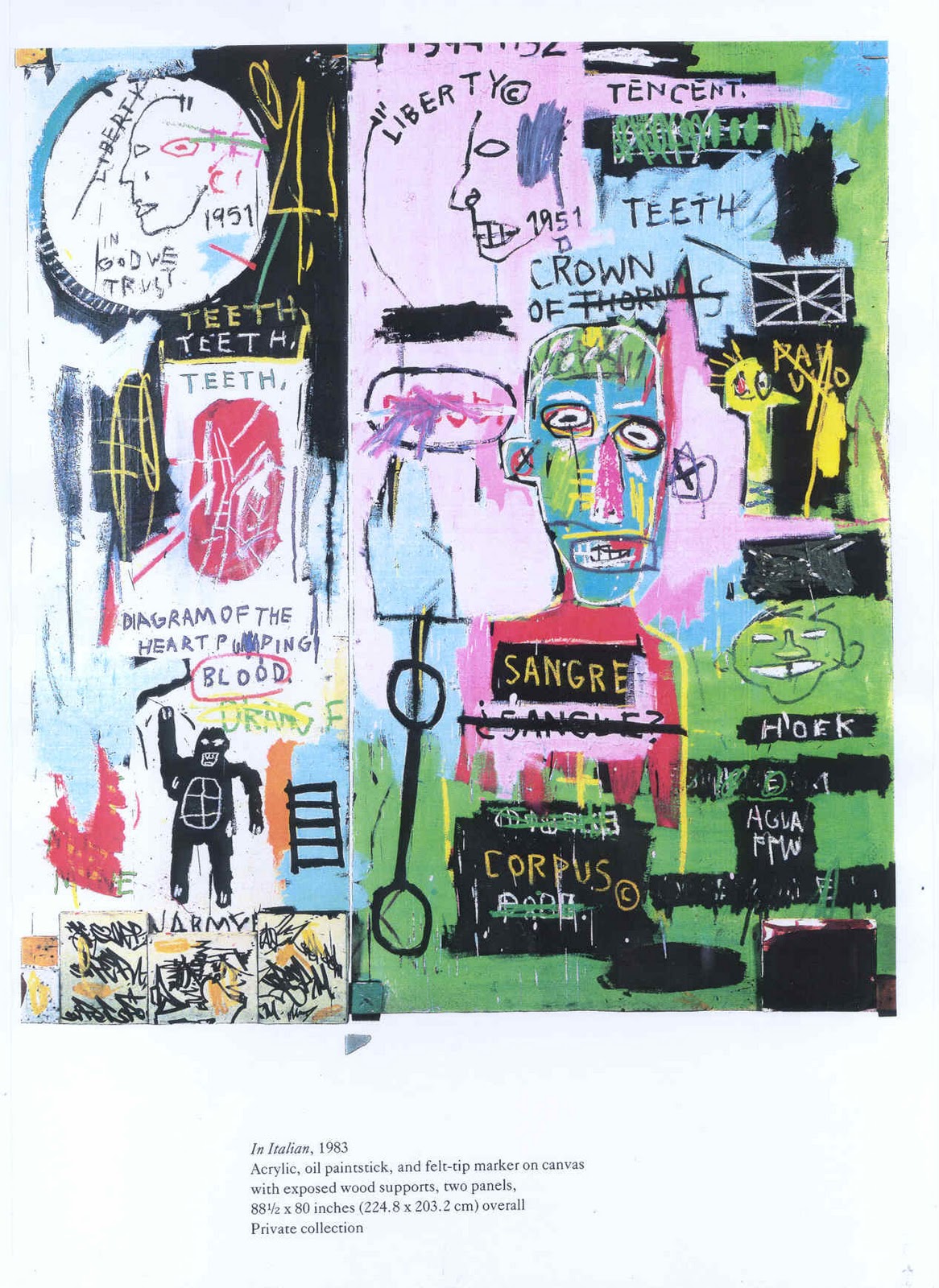 Folheava um catálogo com as obras de Jean-Michel Basquiat (1960-1988), quando fui tomada pela curiosidade. Comecei a me fazer algumas perguntas e cada vez mais queria entender seu processo de criação, sua origem, suas influências. Talvez o pasmo inicial não tenha nascido essencialmente da catarse causada por sua obra (o que em nenhum momento nega sua “qualidade”, da qual falarei adiante), mas em meus primeiros contatos com ela fui, aos poucos, percebendo sua multiplicidade. Lembro-me de um trabalho em especial, “In italian” (imagem 2), de 1983, que de imediato evidencia inúmeros aspectos presentes em sua linguagem visual e que adiante me levaria a questões sobre sua simbologia, o marketing em torno de seu trabalho, a retomada da pintura nos anos 80 — e a periodização e questionamentos sobre o pós-modernismo — as vertentes existentes naquele momento, o Neo-expressionismo, a Transvanguarda, a remanescência Pop, a condição de artista marginal, a rua, o multiculturalismo. Basquiat nos leva a diversos caminhos e vamos trilhando-os lentamente — o que me levou ao tema principal escolhido: o paradoxo, que é inerente a cada passo. A importância de pesquisá-lo é exatamente verificar como ele mixava todas essas influências, todo esse léxico, num posicionamento quase abrupto com o mundo. Em “In italian” (trabalho composto por dois painéis com técnica mista sobre tela, montada sobre madeira) já temos de início, a partir do título, uma relação com seu multiculturalismo, com a globalização artística presente em Basquiat. Nele vemos muitas palavras escritas, que fazem parte da influência do graffiti, da arte da rua, em seu vocabulário plástico. O símbolo da copyright está lá, recorrente em sua carreira, desde quando grafitava o metrô; encontramos também a palavra “crown”, a coroa, que tem para o artista grande significado — evocava o desejo de poder e de glória. A cor explode em sua tela, com verde, misturado ao vermelho, preto, rosa, azul, branco, cinza — o que seria uma característica neo-expressionista, onde as cores “falam” por si só, havendo ainda a presença do romantismo, ao explicitar suas emoções, e da bad painting. Temos a volta da figuração pictórica dos anos 80. Temos também a representação do negro, que será um dos meios utilizados por ele para expressar seus questionamentos políticos em relação às questões raciais, sobre sua condição de artista negro descendente de latinos. “Blood”, “heart”, “sangre”, “corpus” e “teeth” estão escritos, mostrando seu interesse por questões anatômicas e relacionadas ao corpo humano, que também será comum em sua obra. Vemos o desenho de uma moeda (talvez um “dime”, já que temos ao lado escrito “ten cent”) com a inscrição presente no dinheiro norte-americano: “In God we trust”, decerto ironizando a relação religião-economia, onde a palavra “liberty” aparece riscada.