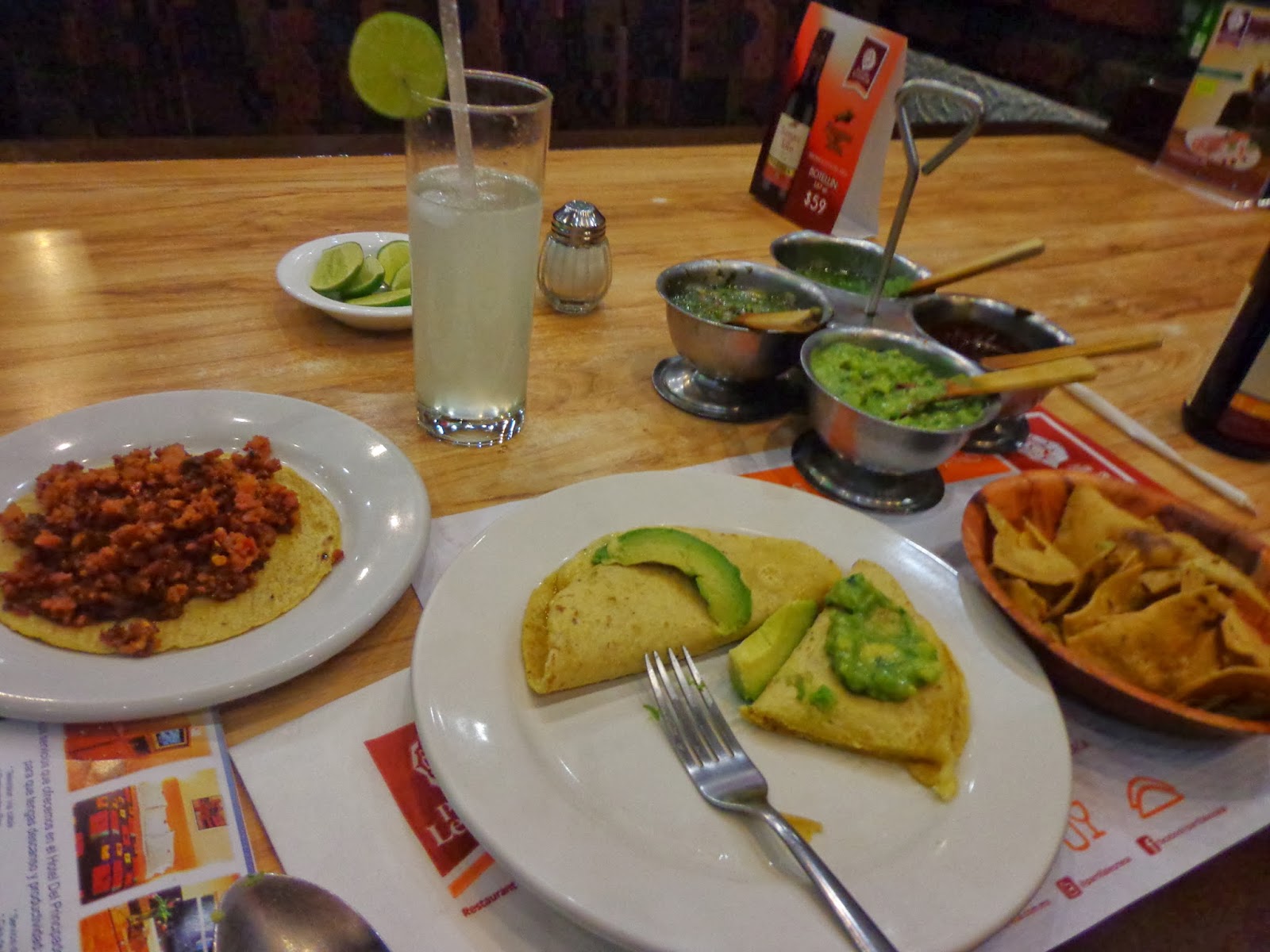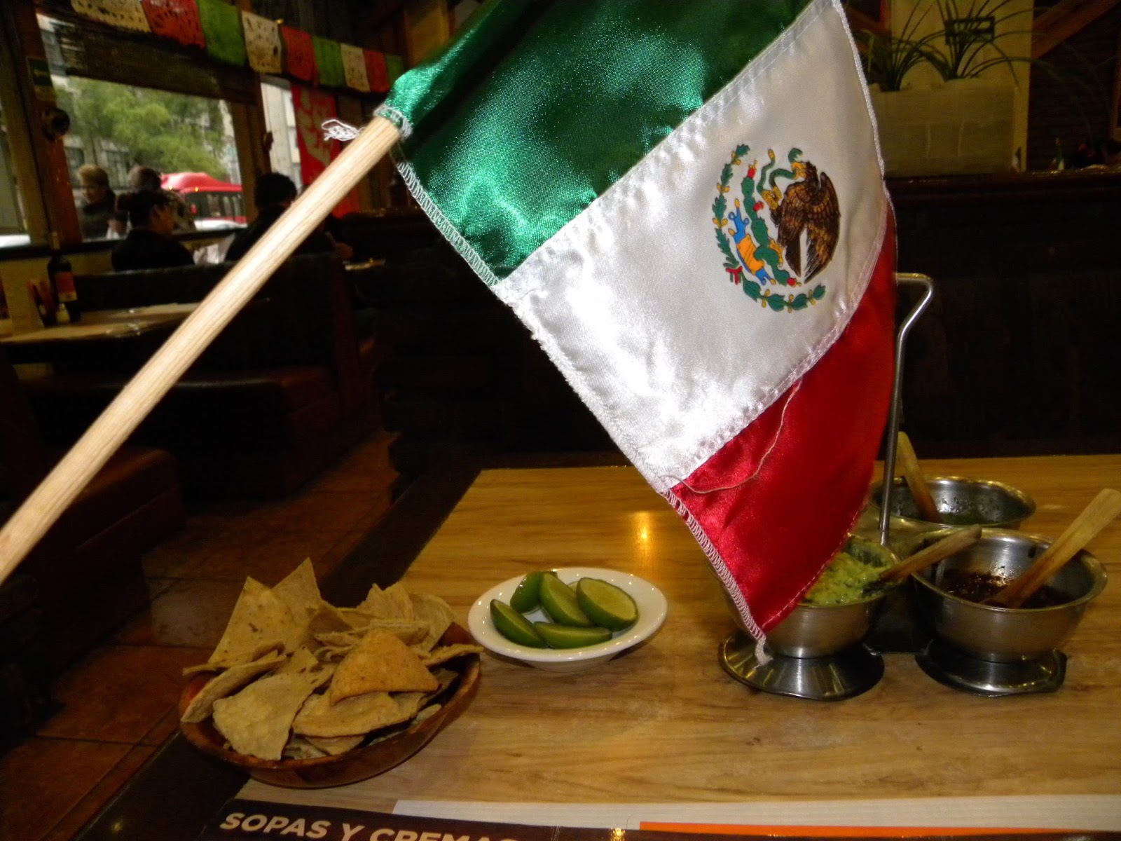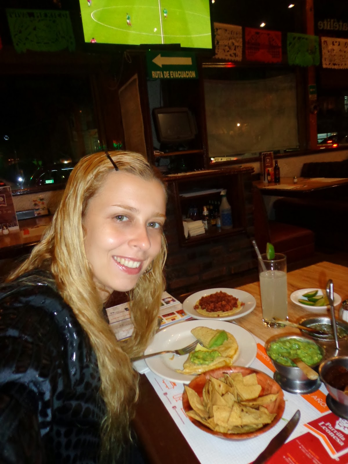 Após um banho demorado, desci e perguntei o sentido mais seguro para caminhar na Zona Rosa. Embora cansada, não desanimei e fui comer a famosa comida mexicana num restaurante próximo: Parrila Leonesa. Lembro que degustei tacos, burritos, guacamole, limonada, quesadilla e me custou 90 pesos (20 reais). No segunda visita, ganhei uma bandeira do país, prova da cordialidade mexicana.