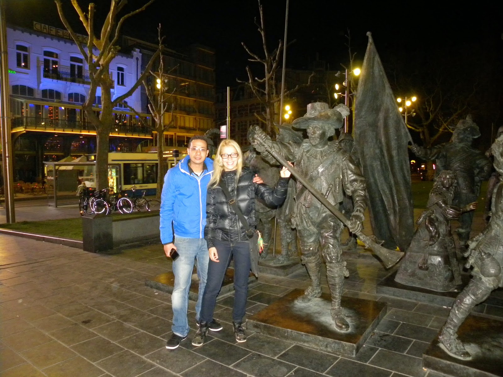 | O cara simplesmente se infiltrou na minha foto! Sai daí! Achei que a fotógrafa era namorada dele, mas fiquei na dúvida depois dessa. A ronda da noite na Rembrandtplein (já tinha passado da meia-noite e era ronda noturna literalmente). |