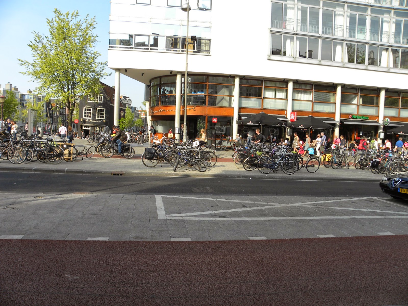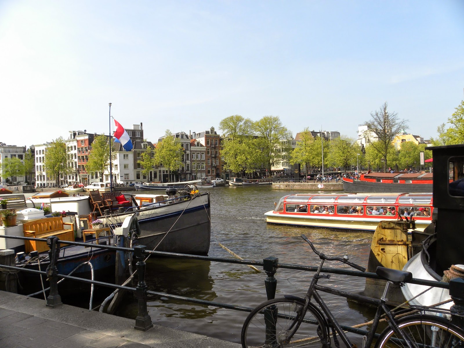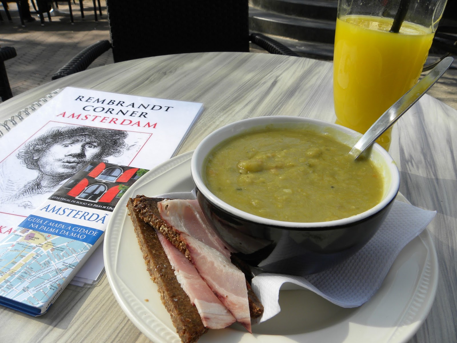 No primeiro dia, fiz um reconhecimento da vizinhança. Tirei fotos na Rembrandtplein e do rio Amstel. Depois procurei a “comida típica”: sopa de ervilha. Tomei um susto quando vi a conta: o suco de laranja custava 7 euros!!! Observação: muitos estabelecimentos não aceitam cartão de crédito. Pergunte antes.