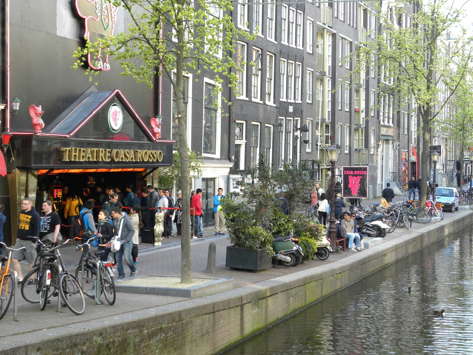 Visitei o Red Light District (zona de prostituição com sexo pago e legalizado) num feriado e as ruas estavam agitadíssimas. Eu ria sozinha observando as pessoas e as lojas. Estava flanando quando, de repente, me deparei com uma mulher horrível numa daquelas janelas. Por outro lado, também vi uma mulher lindíssima – de cair o queixo. Fiz duas visitas no mesmo dia – para ver como me diverti. Comi por lá, fotografei e pensei em visitar um show de sexo explícito na casa mais famosa: Casa Rosso. Fiquei olhando os frequentadores – muitos chineses. Desisti, pois achei muito turístico. aahahaha