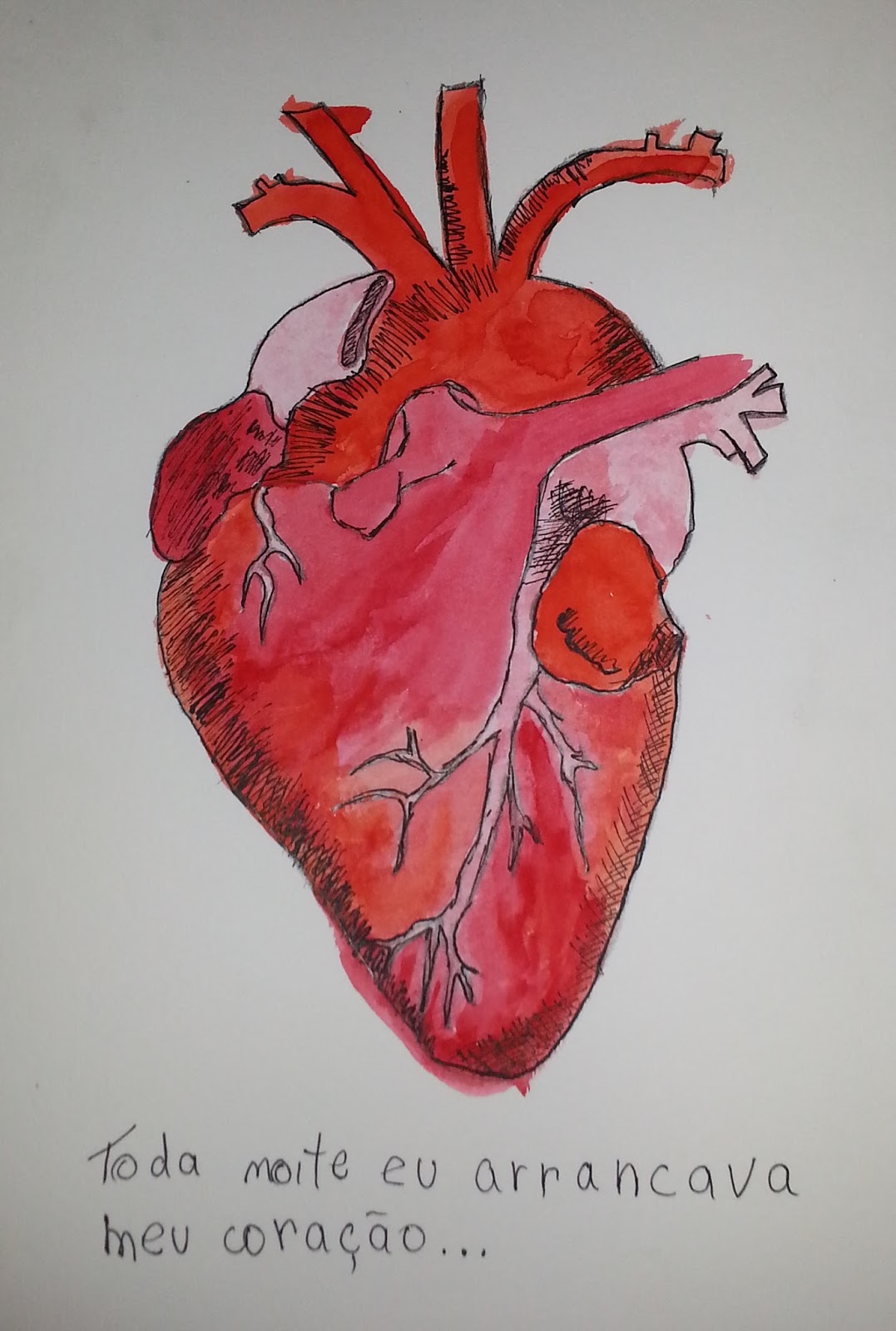 O desenho abaixo foi feito com lápis 4B sobre papel canson (o de 200g, mas já comprei o próprio pra aquarela), pintado com aquarela e contornado/hachurado com nanquim – aplicado com pena.