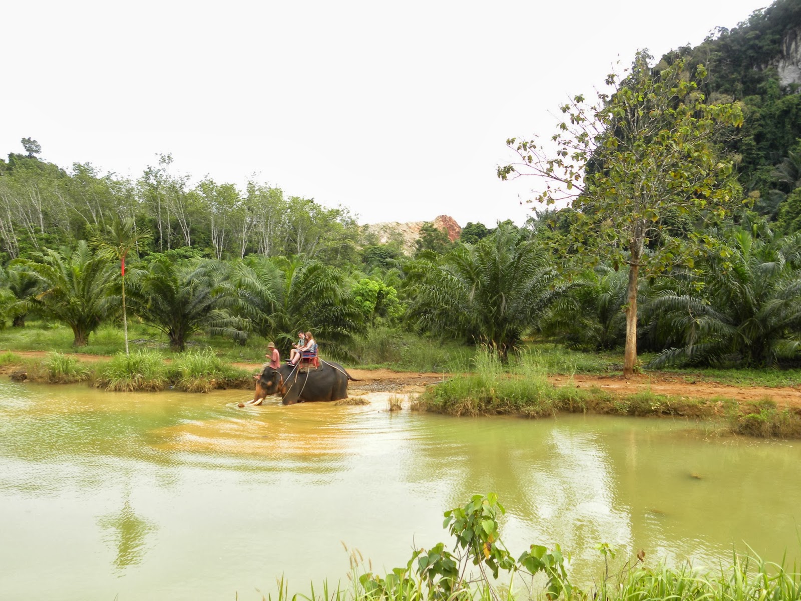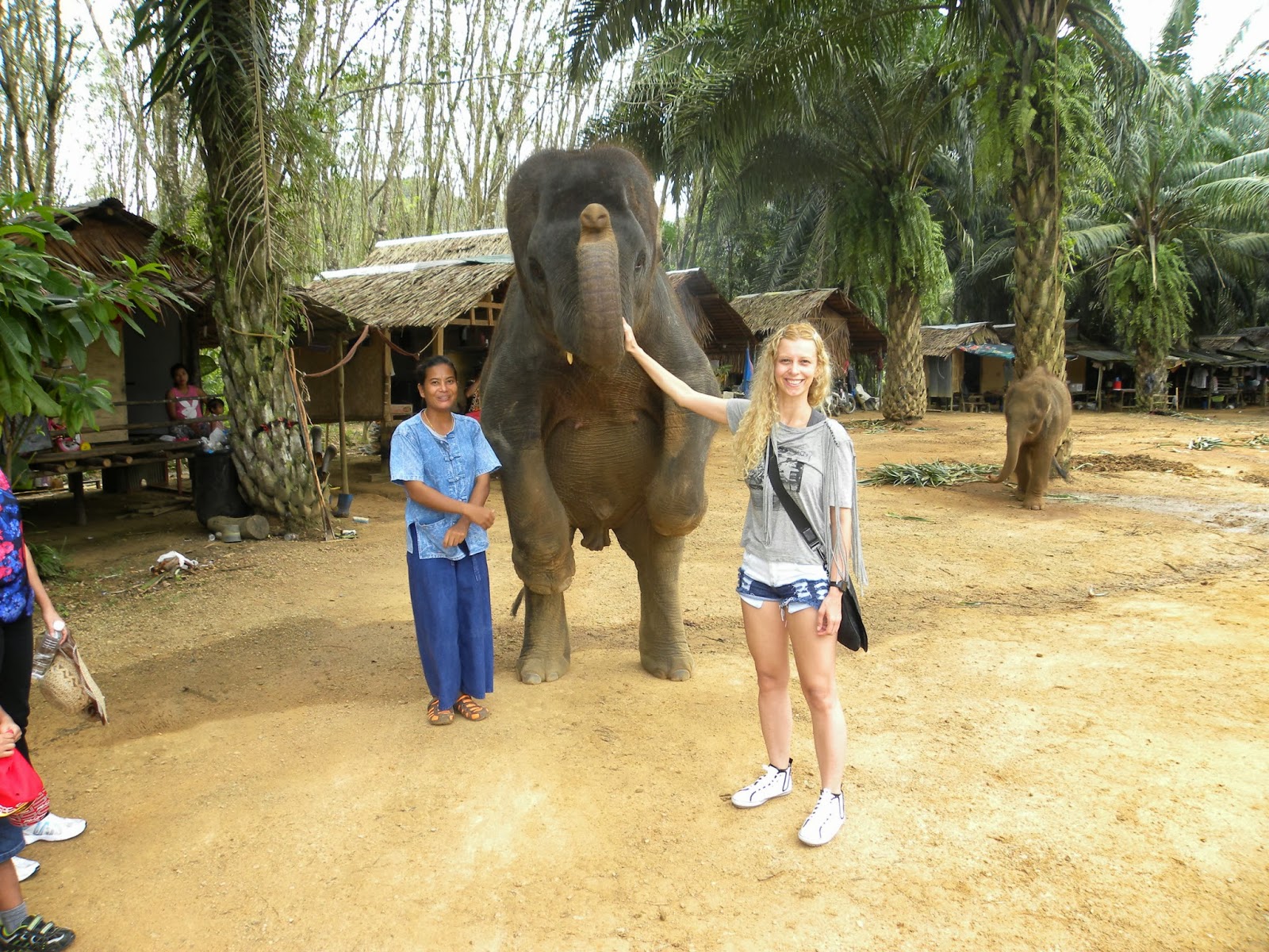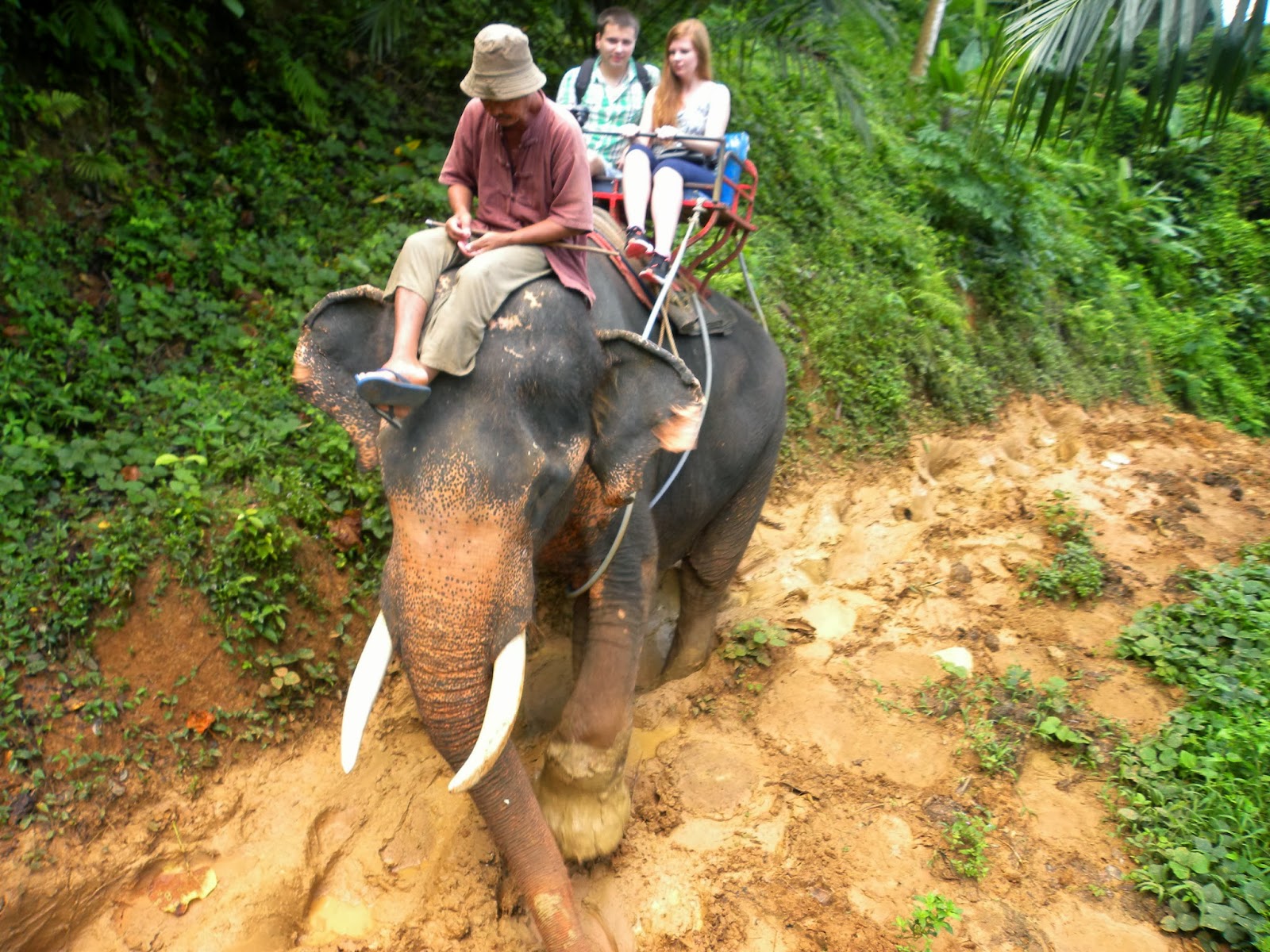 O passeio de elefante ocorreu em Krabi – no meio da floresta. No início, a novidade é interessante, mas depois o movimento do animal se torna cansativo. O árduo serviço do bichinho é recompensado com bananas, compradas pelos visitantes. O baby elefante é lindo, treinado, dança e faz gracinhas.