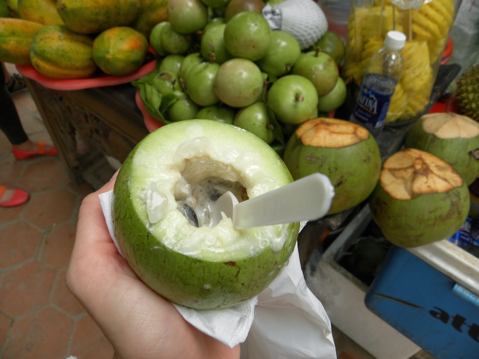 Na região do One Pillar Pagoda, comi uma das frutas mais exóticas da viagem, no entanto, continuo desconhecendo o nome. Parece uma goiaba, mas a casca é lisa e não comestível, no interior tem um líquido semelhante ao leite. Muito boa e foi dada pela vendedora.