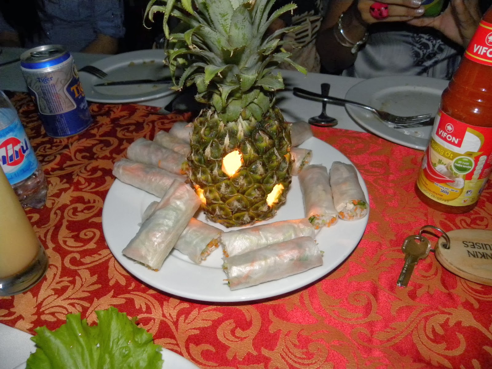 No barco, foi servido um jantar de Halloween. No caminho para Ha Long Bay, o guia perguntou a preferência alimentar de cada um. Me senti aliviada em dizer que queria comida vegetariana, pois apareceram carnes e frutos do mar que jamais conseguiria ingerir na vida.