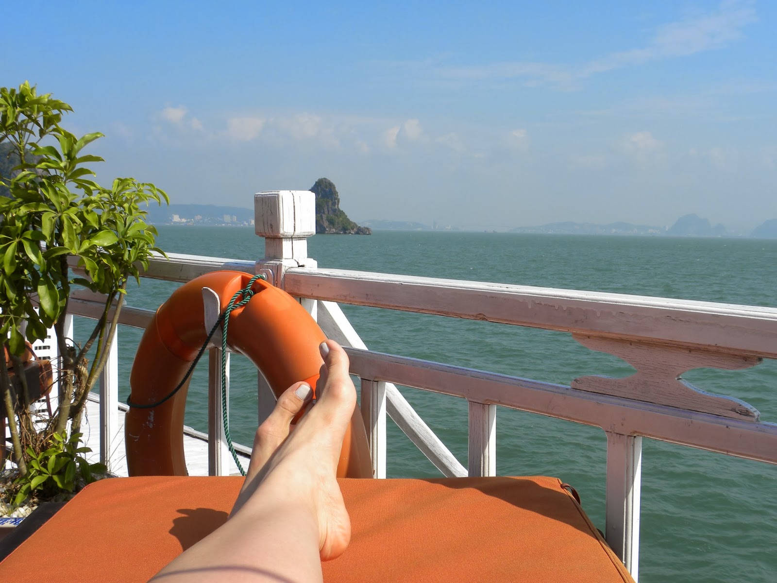 Uma van foi ao hotel às 9 horas para buscar os passageiros. A viagem durou aproximadamente 2 horas. Chegando na baía, as pessoas são transportadas em barco pequeno até o barco maior, que me hospedou por 2 dias. No primeiro dia, a paisagem estava nublada, com o céu cor de chumbo, mas no dia seguinte o sol sorriu.