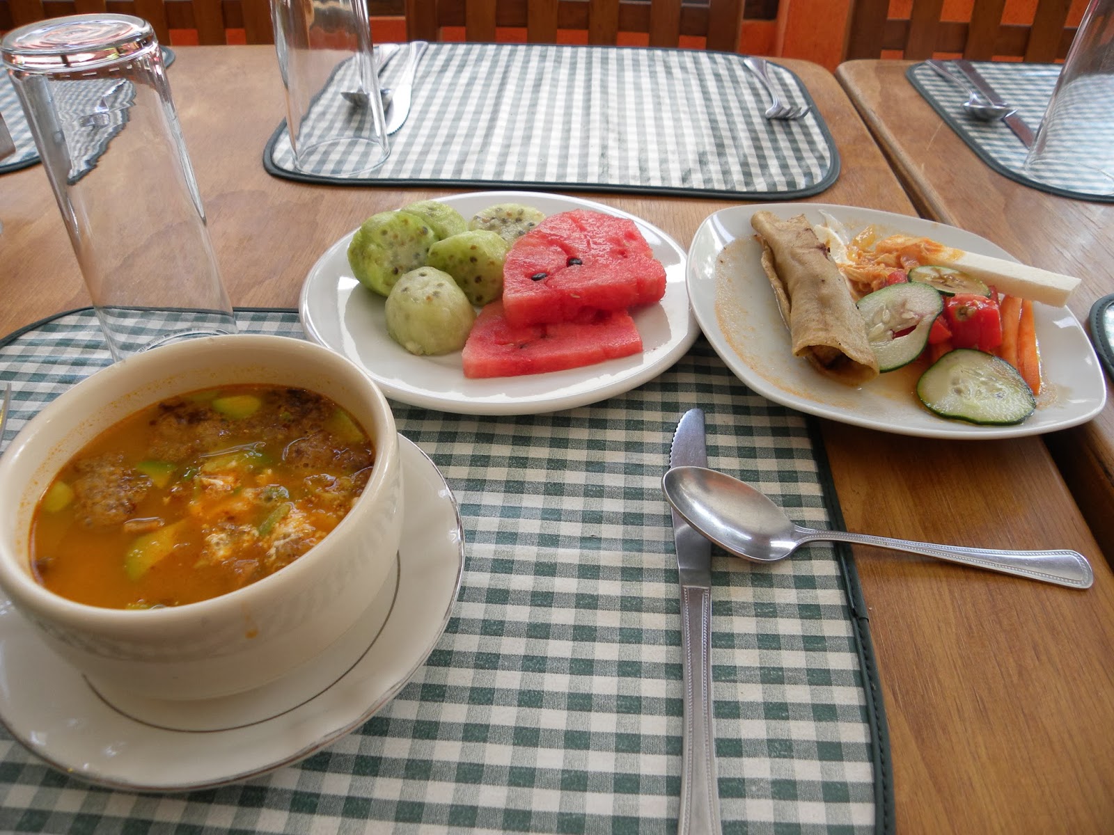 No fim da visita arqueológica, fomos almoçar num restaurante com apresentação de dança folclórica (a comida já estava inclusa no passeio) e comi uma sopa bem diferente, com queijo, abacate e outros ingredientes desconhecidos. Minha sobremesa, como sempre, é composta por frutas. As comuns naquela região são: melancia e tuna.