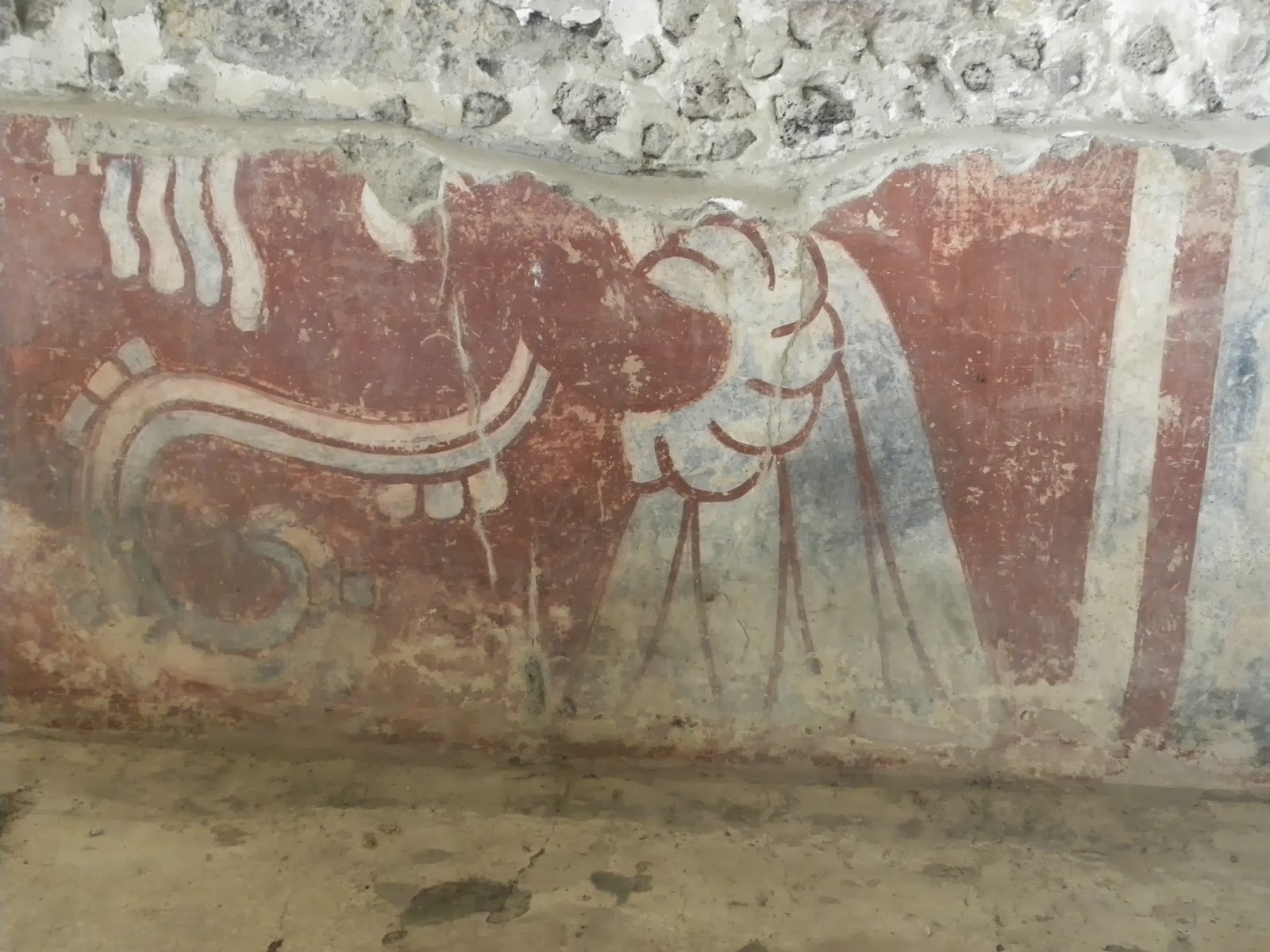 Antes da visita às pirâmides, o guia nos levou numa construção com pinturas, que ainda estão conservadas, daquela sociedade, mas não era uma área de visita, pois tentam restaurar algumas estruturas.