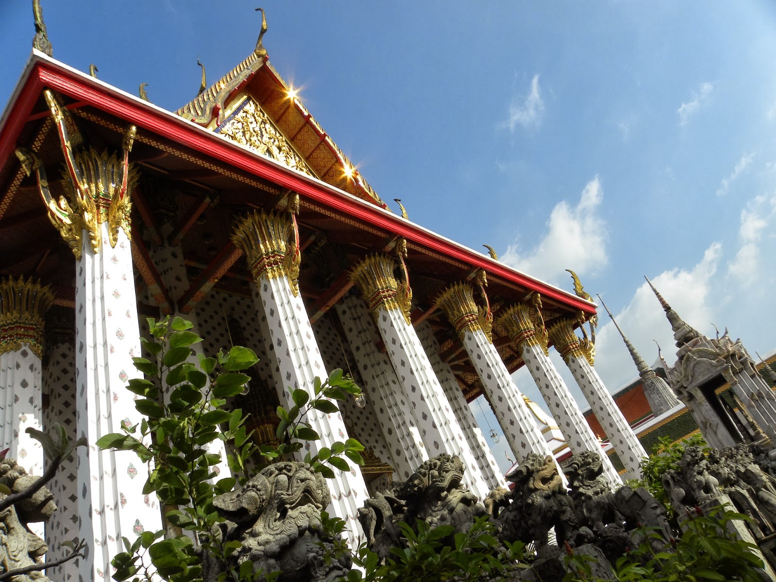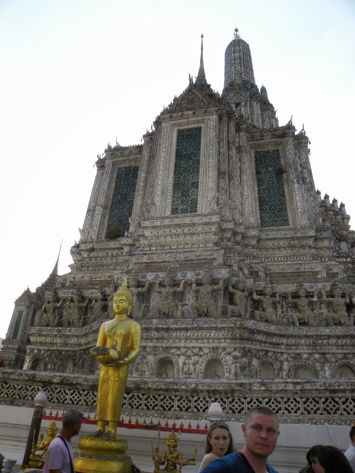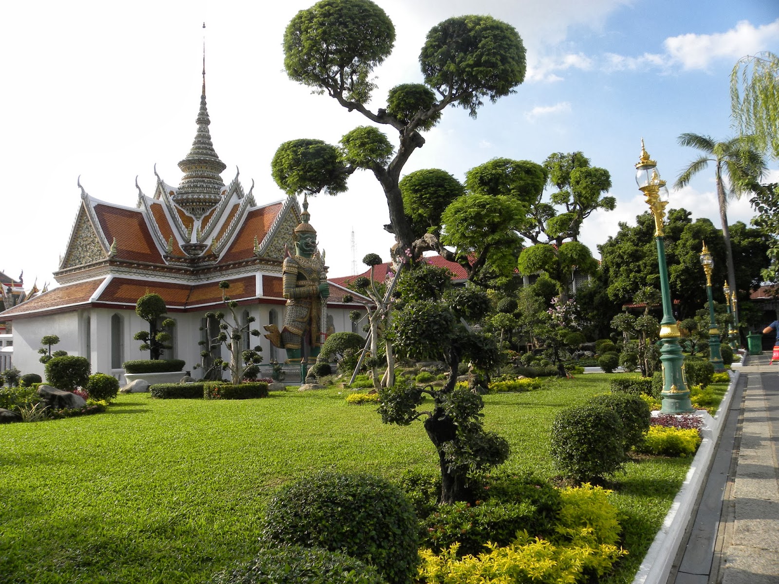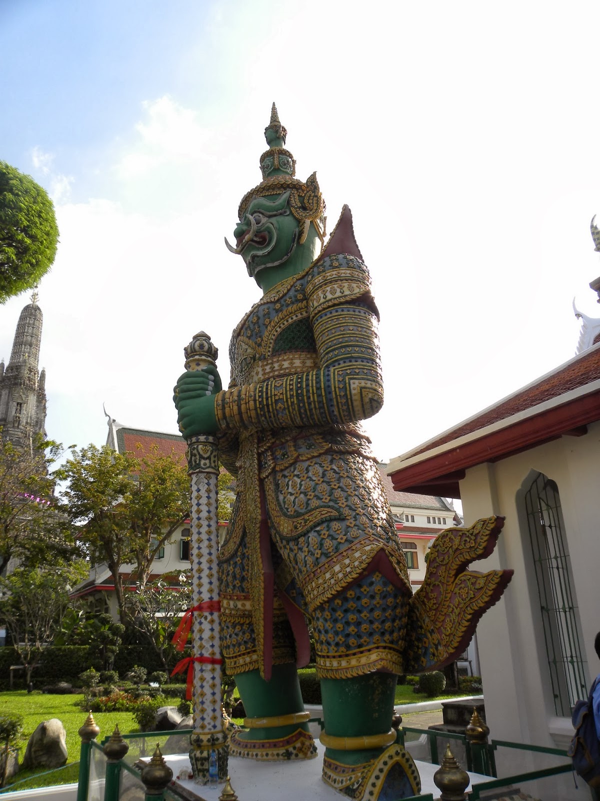 Após o único bate-volta que durou a metade do dia (para Rachaburi), os demais duraram um dia inteiro, aproveitei que a van deixava na entrada da Khao San Road e caminhei até o píer 8 (no caminho tinha um mercado de pulgas), tomei o barco que atravessa o rio, e visitei o templo Wat Arun. Estive no jardim do Grande Palácio, mas decidi não entrar para ver o buda de esmeralda em Wat Phra Kaeo. Custava aproximadamente 50 reais.