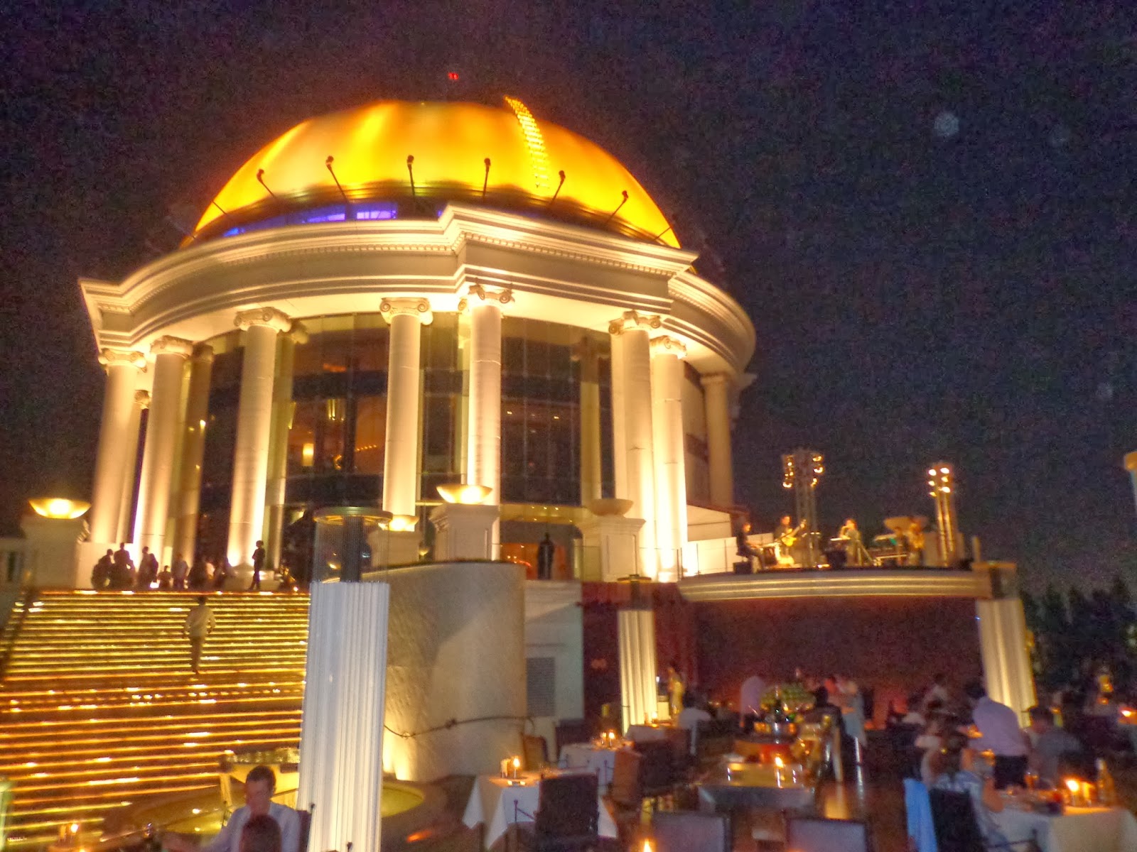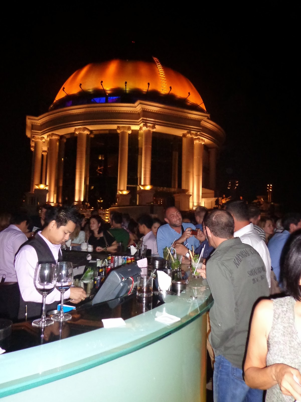 Após um banho e breve descanso, conheceria o lugar mais caro durante a minha estadia: o Sirocco Sky Bar, situado no terraço do hotel Lebua. Foi cenário do filme “Se beber não case 2”, que elevou consideravelmente o número de visitantes (tem uma enorme fila) e o preço das bebidas.