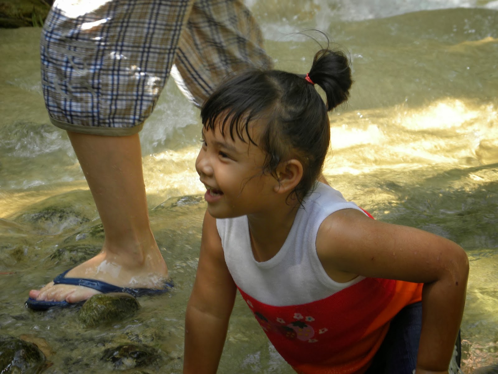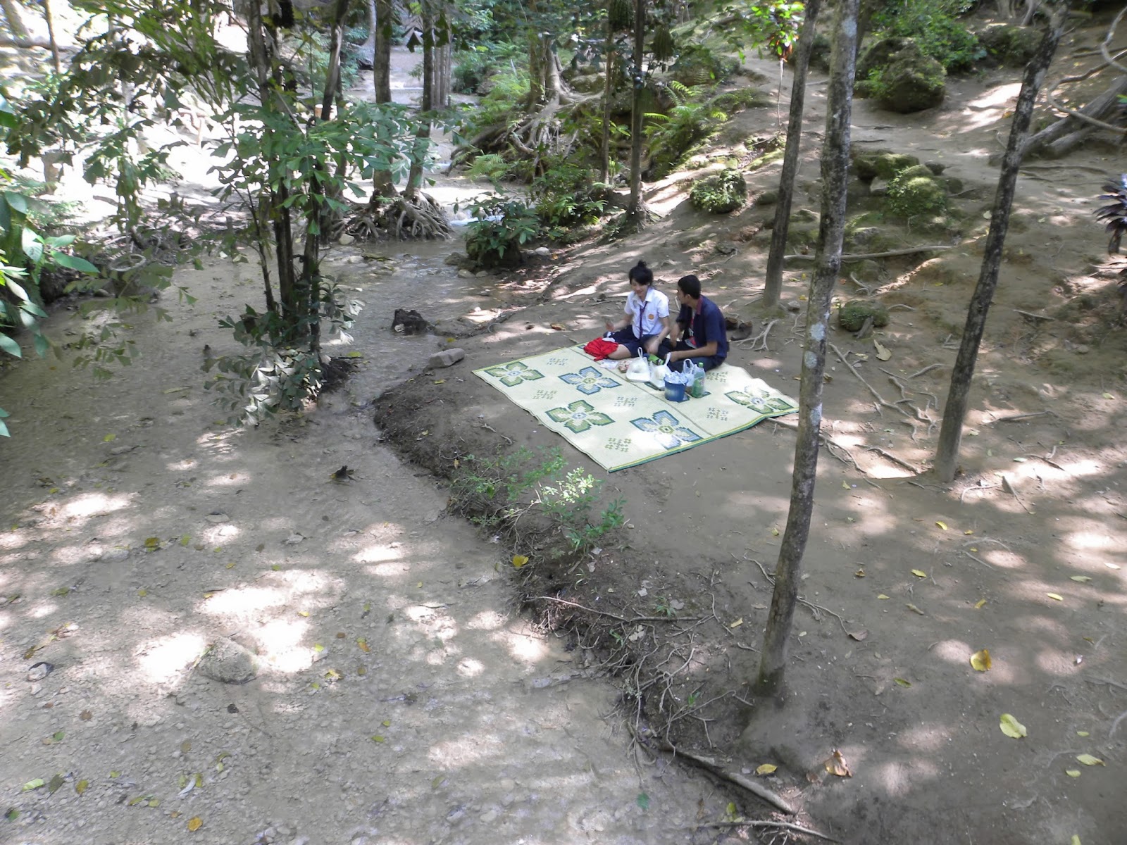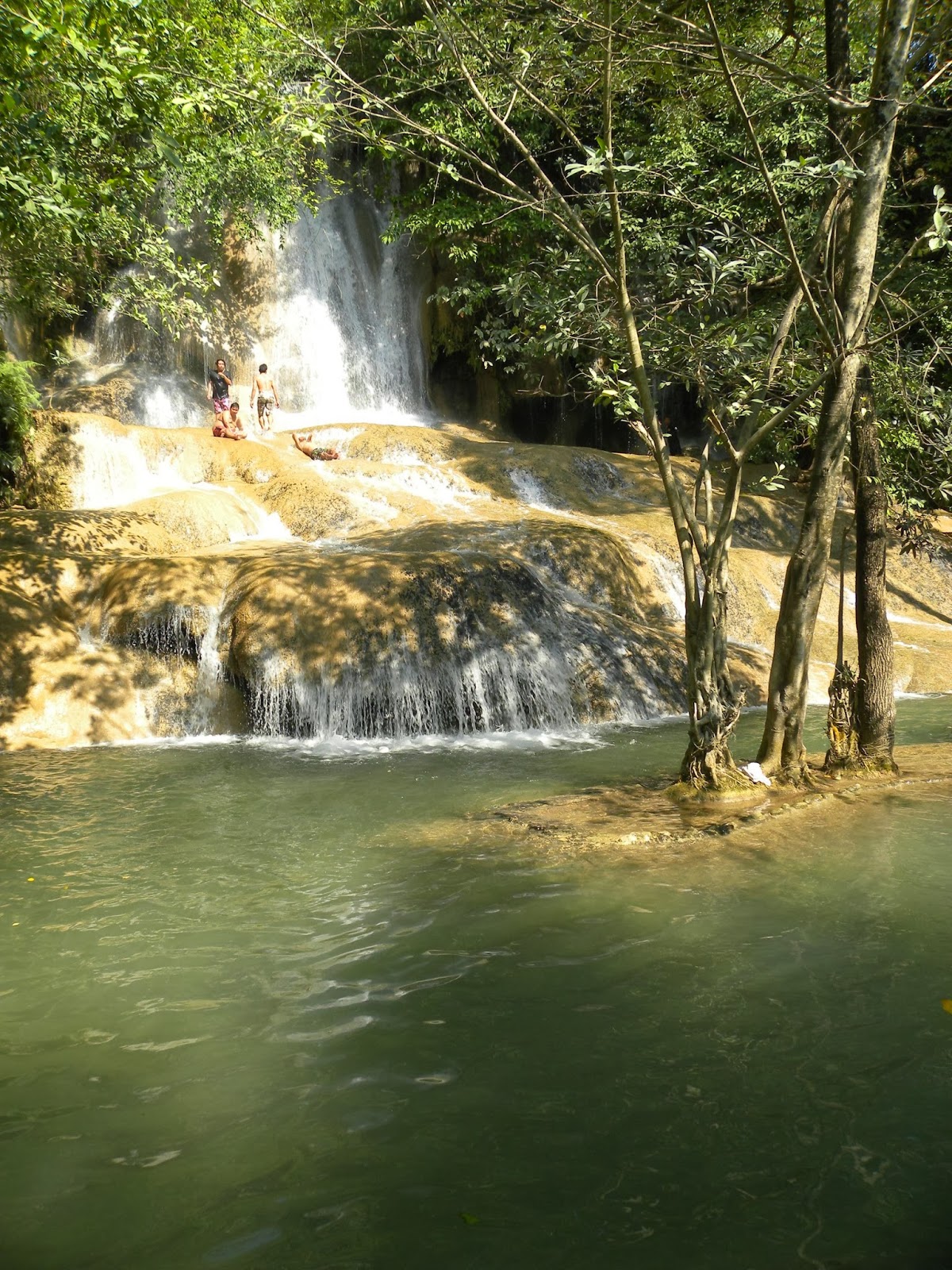 Próxima parada: uma linda cachoeira de água azul, Sai Yok Noi. A cachoeira fica no parque florestal Sai Yok National Park e é um refúgio encantador. Reparei que todos os tailandeses tomavam banho de roupa. Muitos faziam piquenique. Lá provei uma iguaria da região: bananas (e outras frutas) fritas da mesma forma que a batata chips, com vários sabores (doce e salgada).