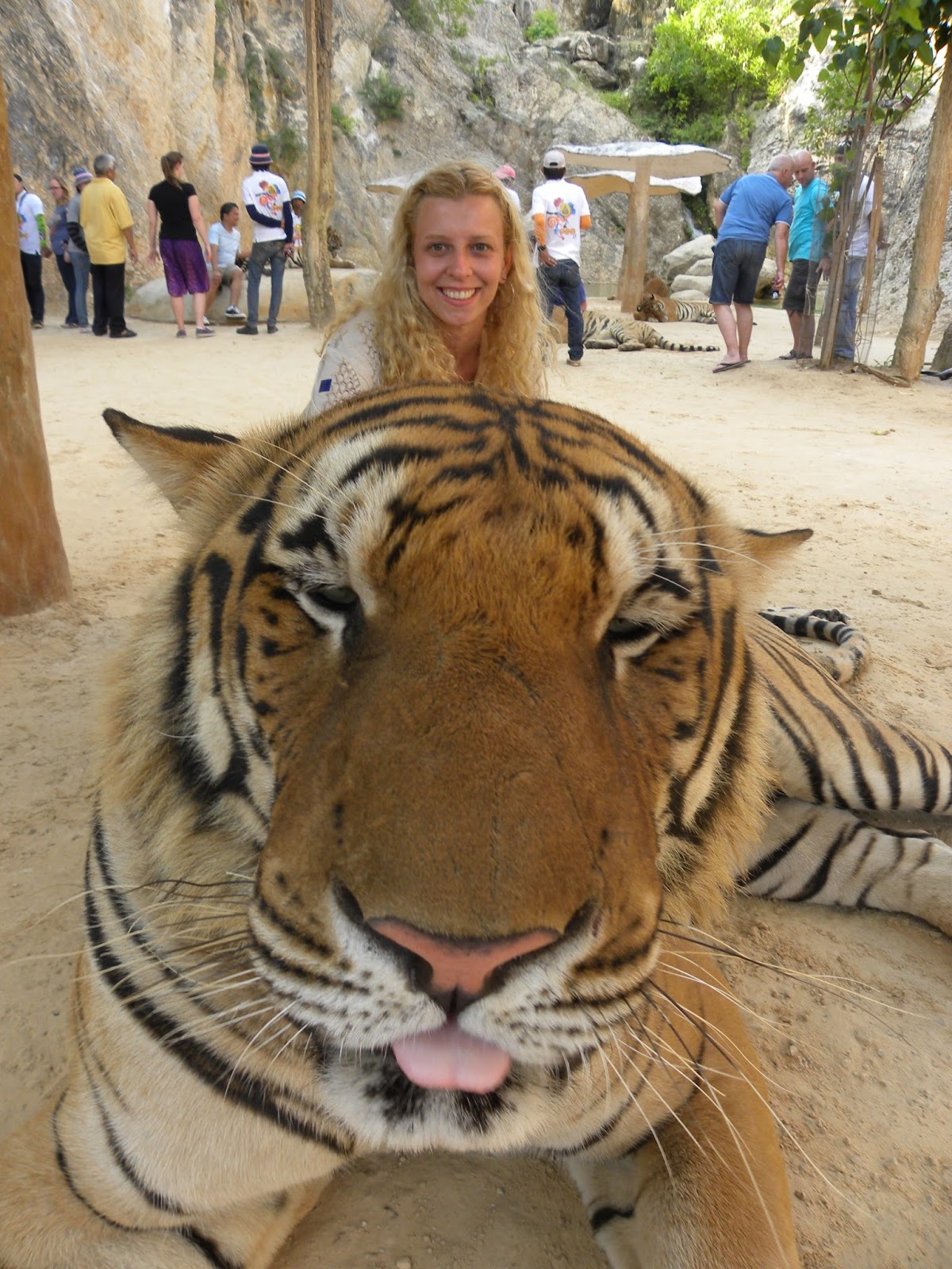 Finalmente o lugar mais aguardado do dia: Tiger Temple (Wat Pha Luang Ta Bua). Infelizmente cheguei no horário da última atração da programação, mas gostaria de ter passado o dia para amamentar os tigres pequenos e tomar banho com eles na cachoeira. Levei a calça jeans para vestir no banheiro que fica na entrada, pois é um templo budista, portanto, requer que os ombros estejam cobertos e pernas idem. A entrada custa 600 baht para estrangeiro e 300 baht para tailandês. Não pode usar roupas com vermelho, laranja e rosa.