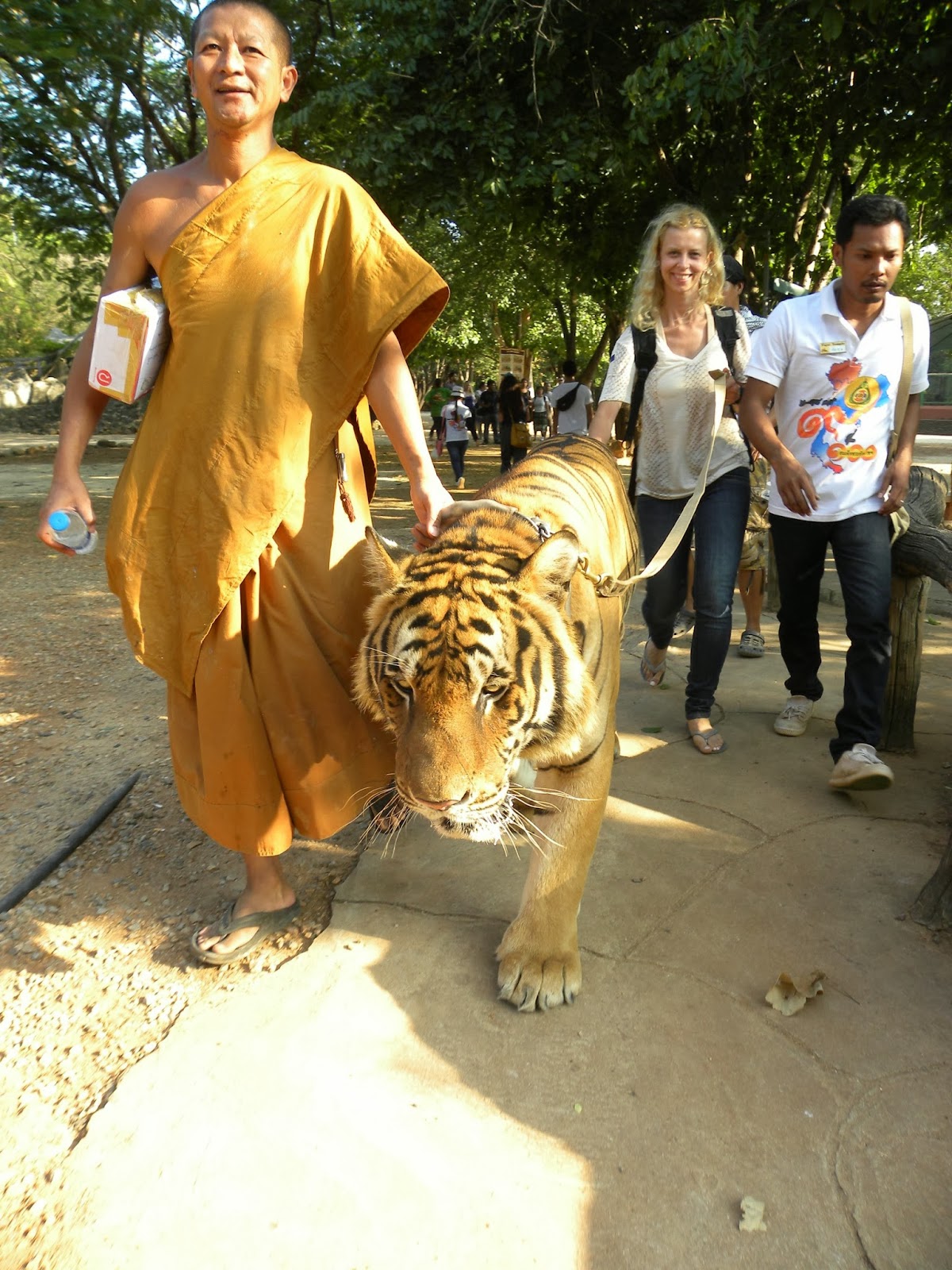 Aguardei na fila para tirar fotos com os tigres. Você entrega a câmera para um dos voluntários, que te fotografa com os felinos. Depois consegui caminhar com um tigre e o monge.