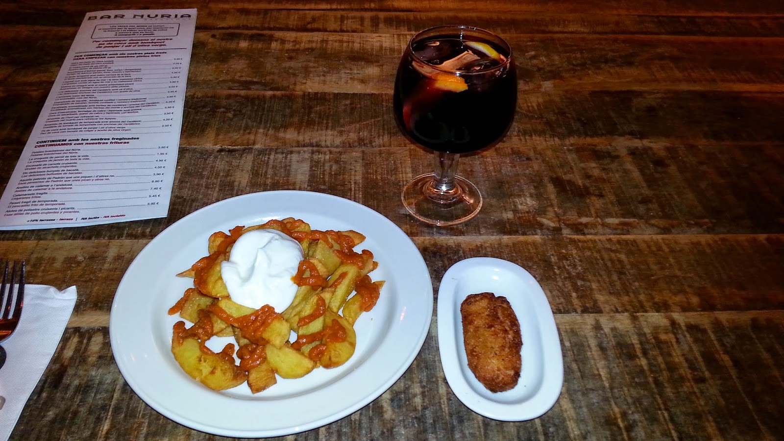 Descansei por alguns minutos no hostal e procurei um lugar para me iniciar no mundo das tapas. Caminhei pela Plaça Reial, com inúmeros restaurantes, mas acabei comendo no Restaurante Nuria, na Rambla. Pedi as famosas “patatas bravas”, croqueta de pernil e sangría. Tudo delicioso, mas depois pude confirmar que é infinitamente mais caro que em Madri.