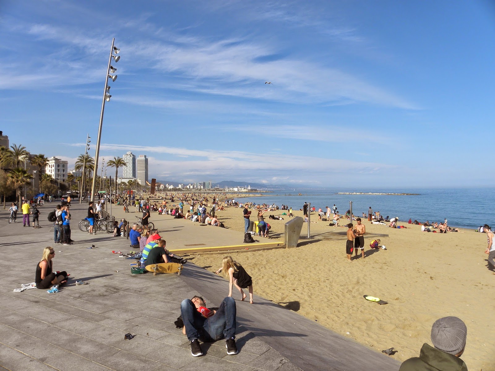 Saindo do parque, caminhei por 1 km até o metrô de Lesseps e segui para a praia de Barceloneta, que estava cheia. Foi ótimo caminhar por toda a orla. Observei que os apartamentos beira-mar não apresentam qualquer ostentação e a praia me lembrou Venice Beach, na Califórnia. Ao retornar por volta das 8, percebi que já não tinha como visitar o Palau Güell.