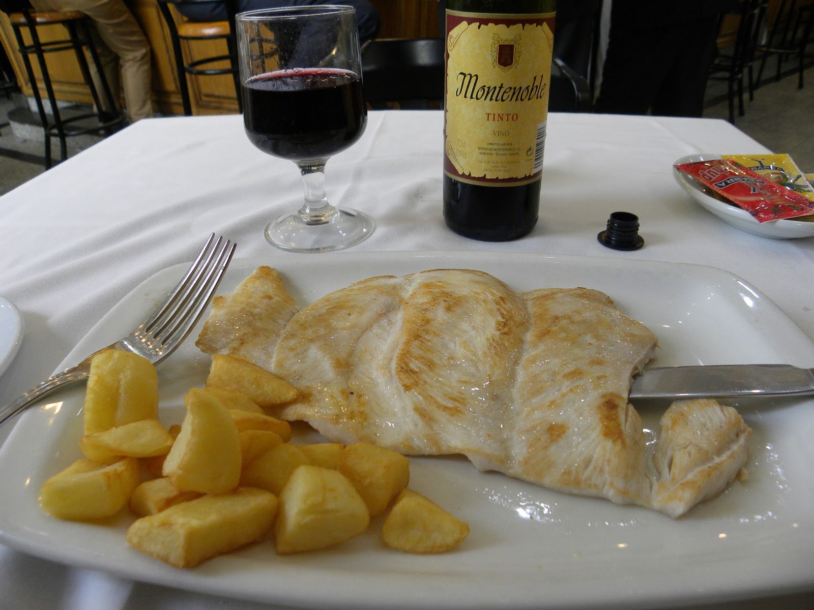 Parei para almoçar no restaurante de um hotel próximo, Hotel Mora, e constatei que a cidade é barata. Tinha a opção de dois pratos, bebida e sobremesa por 10 euros, como quis apenas um, paguei 5 euros e a bebida era uma garrafa de vinho (média), não apenas um copo raso. Escolhi flan de sobremesa. Vi que as tapas acompanhadas por vinho custavam 2 euros.