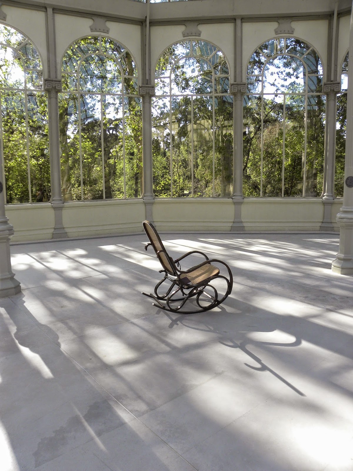 O Parque del Buen Retiro é simplesmente lindíssimo, e, para mim, o melhor parque público que visitei, comparando com o Central Park, Tuileries ou Tiergarten. Ficava a 5 minutos de onde estava hospedada. O parque fica aberto até meia-noite. Foi criado entre 1630 e 1640. Não caminhei por toda a extensão do pulmão madrilenho, que é imenso. Visitei o belíssimo Palácio de Cristal, que tinha uma instalação em seu interior, “Splendide Hotel”, de Dominique Gonzalez-Foerster. Consistia em várias cadeiras de balanço com livros atrelados. Sentei e fiquei ali por quase uma hora. Na proximidade, encontramos um espaço de exposições gratuito, Palacio de Velásquez, com a mostra “Idea: Pintura Fuerza”.