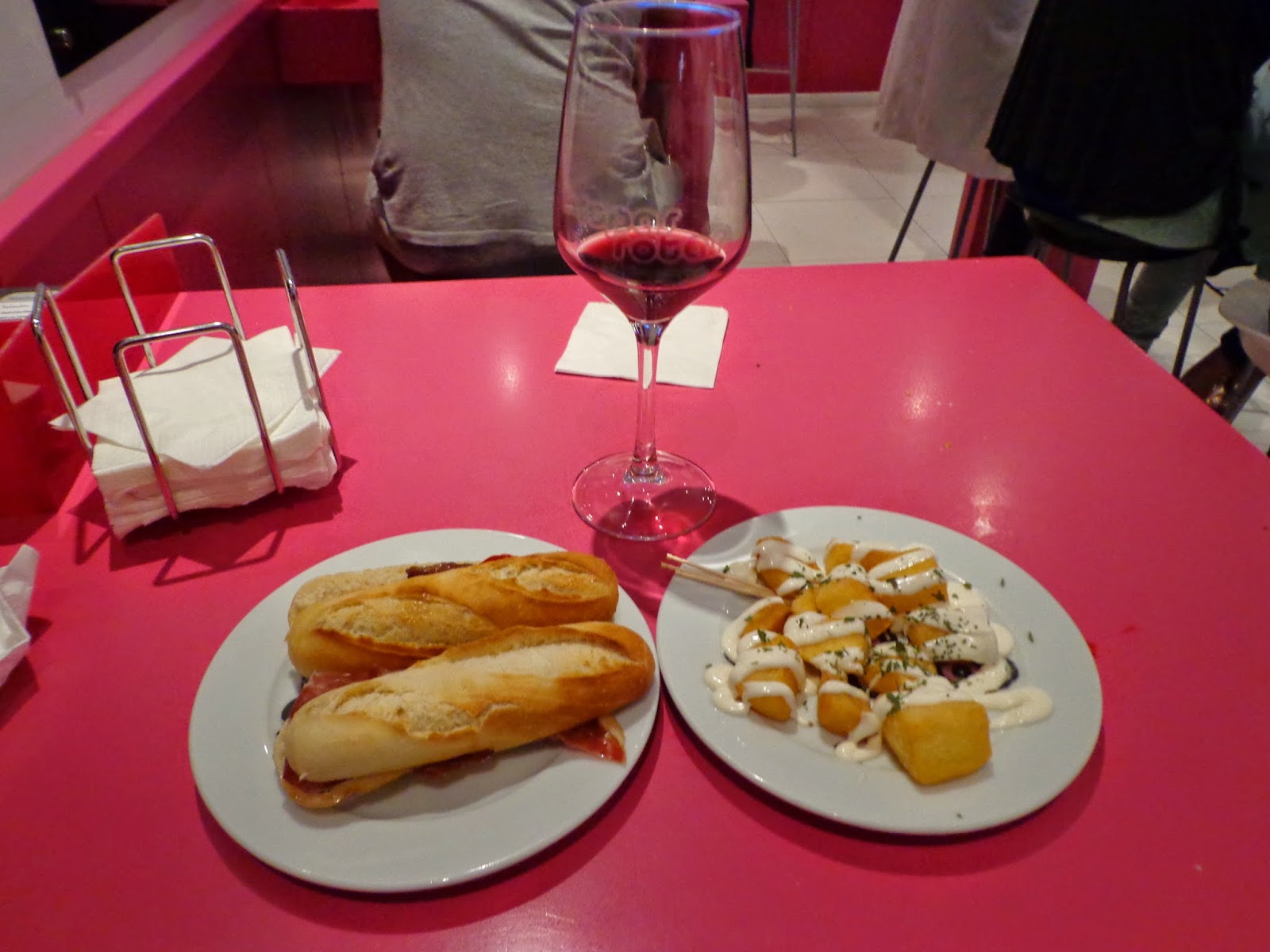 No dia seguinte fiz um bate-volta até Toledo. Na volta, experimentei tapas num bar próximo, Pecaditos. Cada tapa custava 1,20 euros. Tapas são petiscos diversos. Podem ser frios servidos dentro do pão, patatas bravas, chorizo, atum, cebolas fritas, queijos, espetinhos de camarão, croquetes de diversos sabores, etc. Não tive o prazer de comer os pintxos, tapas com palitinhos (parece ser tradição no norte da Espanha).