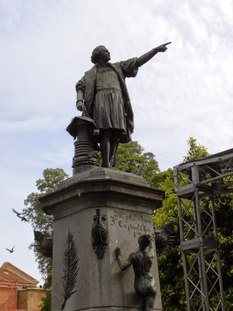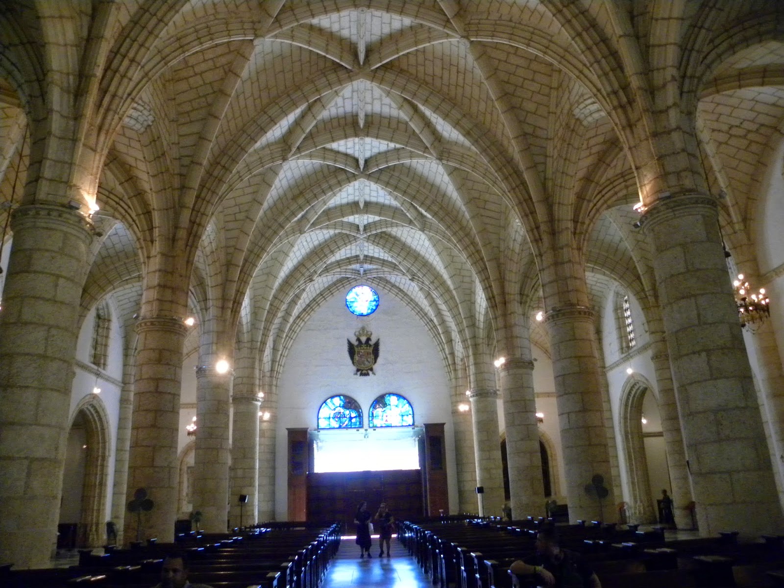 Seguimos para a Catedral de Santa María la Menor, a mais antiga das Américas. Foi construída entre 1521-1541. Atualmente a fachada está sendo reformada. A fachada é renascentista, mas o interior é no estilo gótico. A entrada principal fica na Praça de Colombo, onde encontramos uma estátua erguida em sua homenagem. A igreja tem audioguia e exige que os ombros e pernas estejam cobertas. Estava de short e me emprestaram um lenço para cobrir minhas pernas.