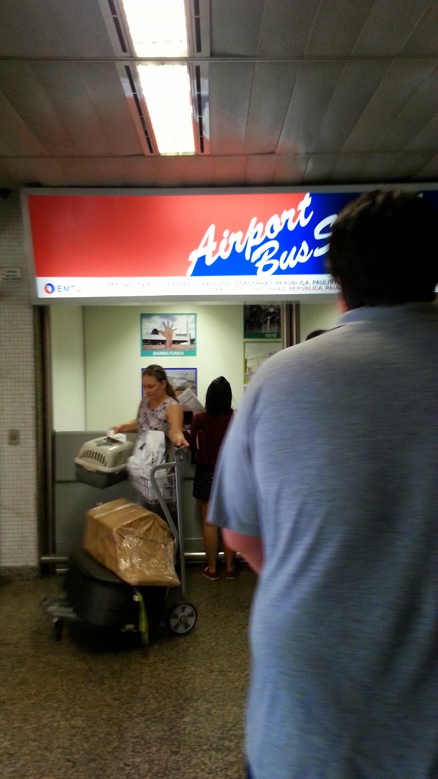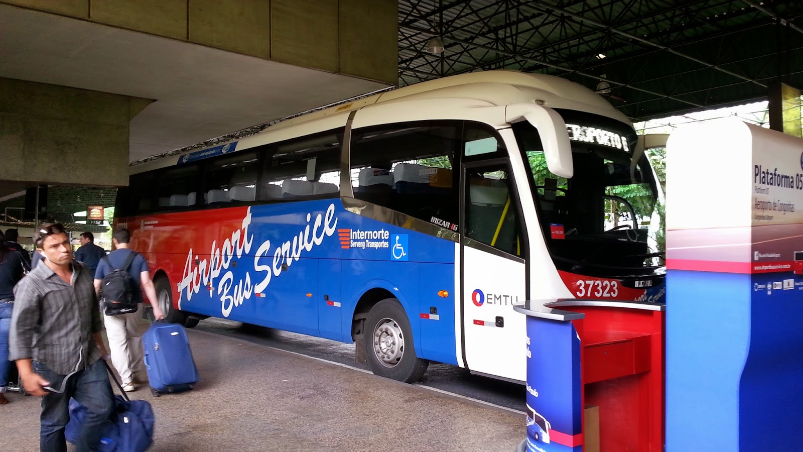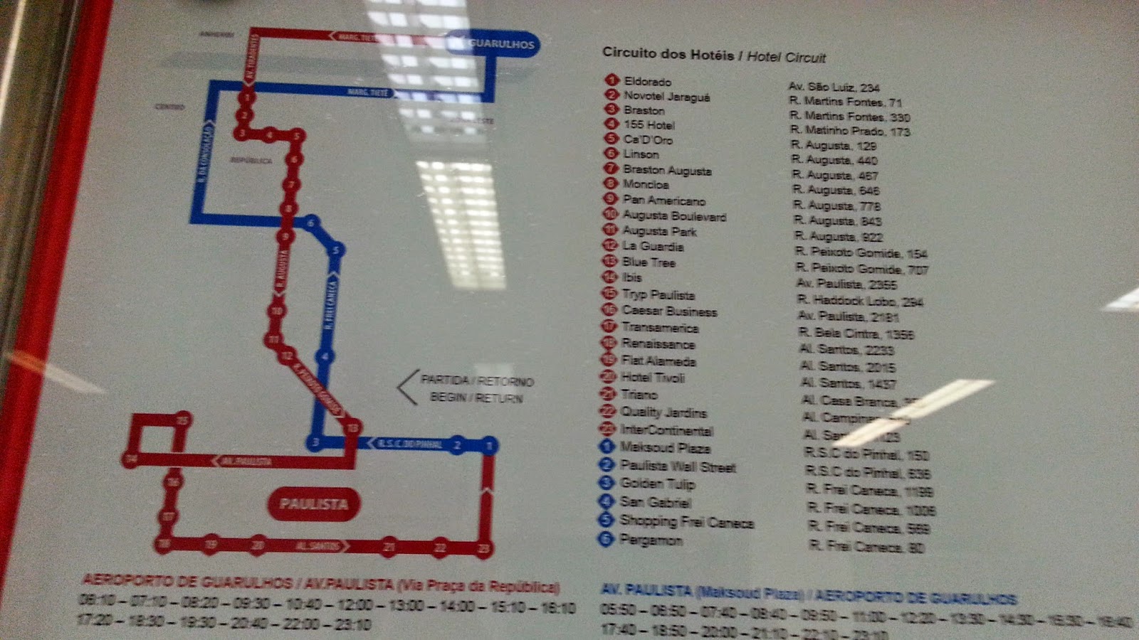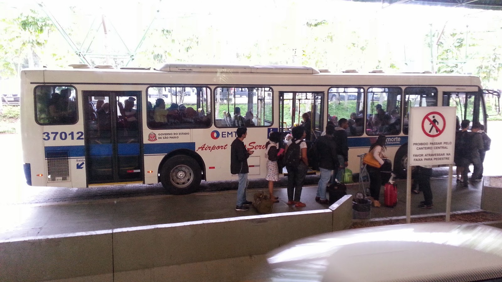 Existem duas opções para sair de ônibus do aeroporto, já que o táxi custa entre R$150 e R$200,00: pode tomar o ônibus executivo, que custa R$36,50, ou o ônibus da linha 257, também preparado para colocar malas, que fica na pista ao lado do executivo e custa R$4,45, mas deixa na estação de metrô Tatuapé, enquanto o executivo Guarulhos-Av. Paulista para em inúmeros hotéis, inclusive no que me hospedaria: Renaissance.