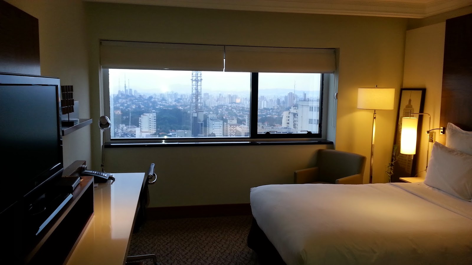 Cheguei no Renaissance por volta das 13:00h (o ônibus me deixou na porta) e tive uma excelente notícia: pude fazer o early check-in! A recepcionista, que ainda recordo o nome, Laura, foi super simpática e me deu outra notícia incrível: recebi um upgrade para o melhor quarto, no 21º andar, além de café da manhã (que não estava incluído na minha diária) e acesso ao Lounge do 23º andar!