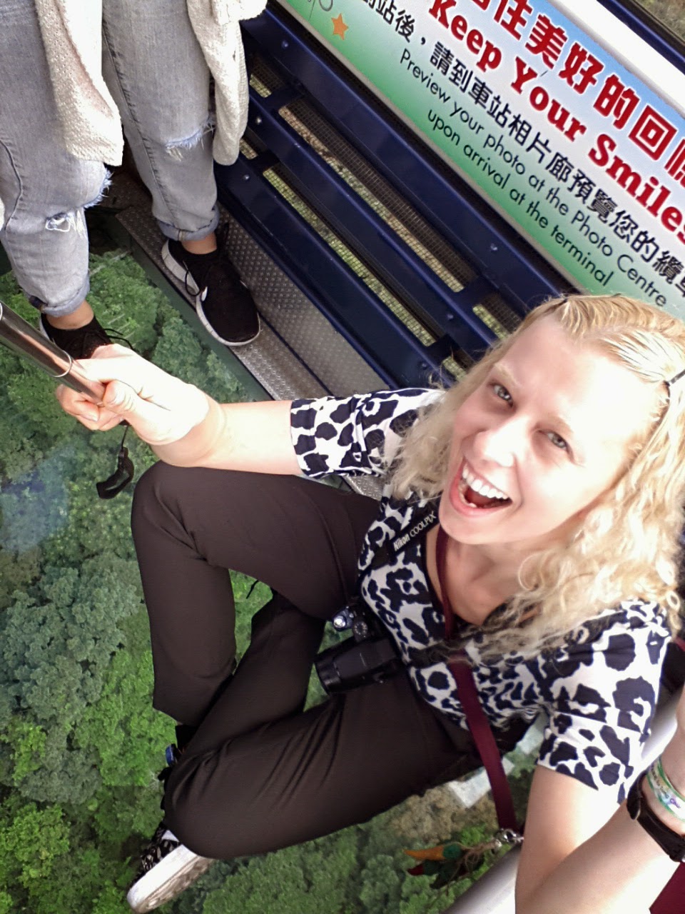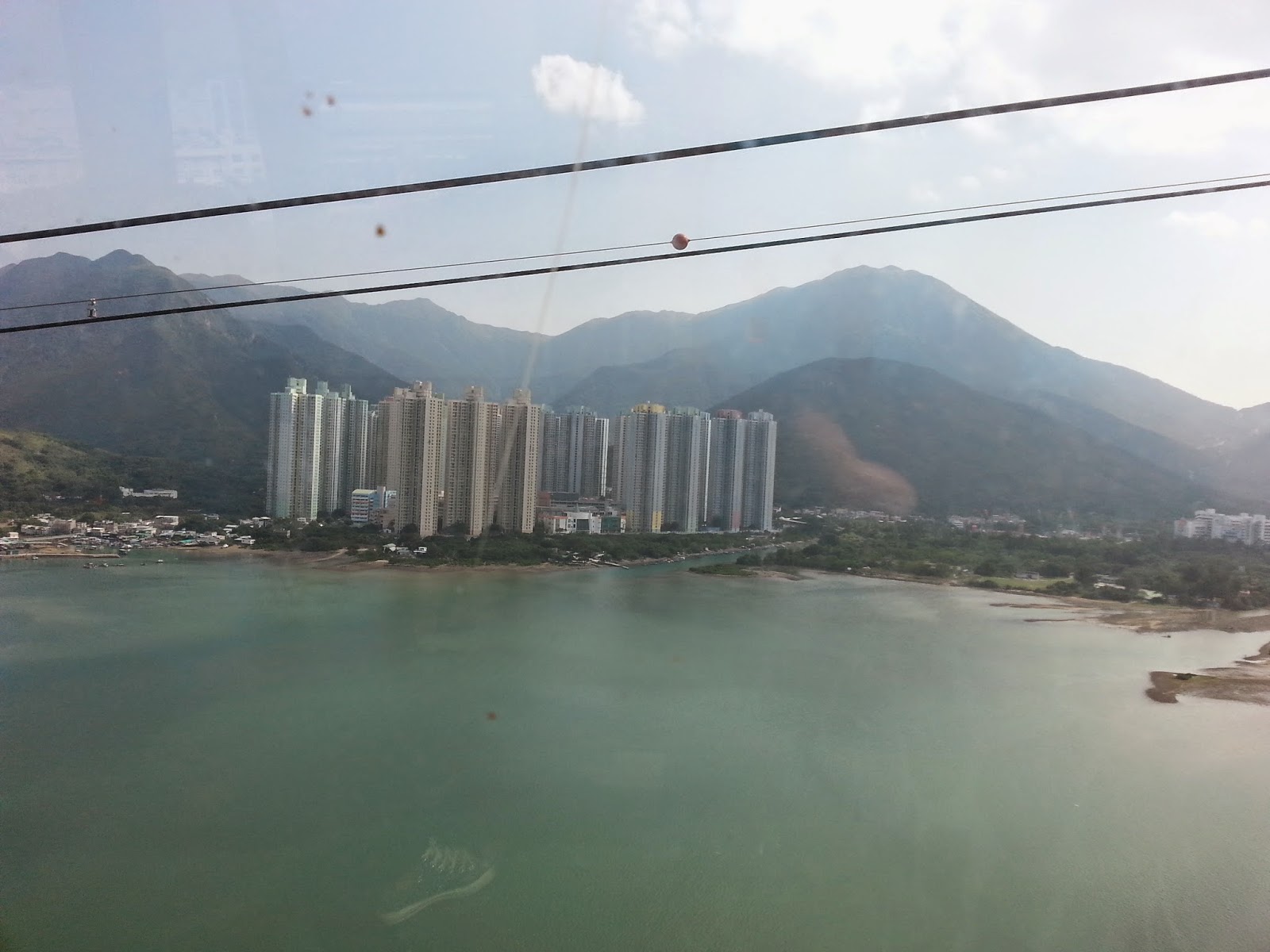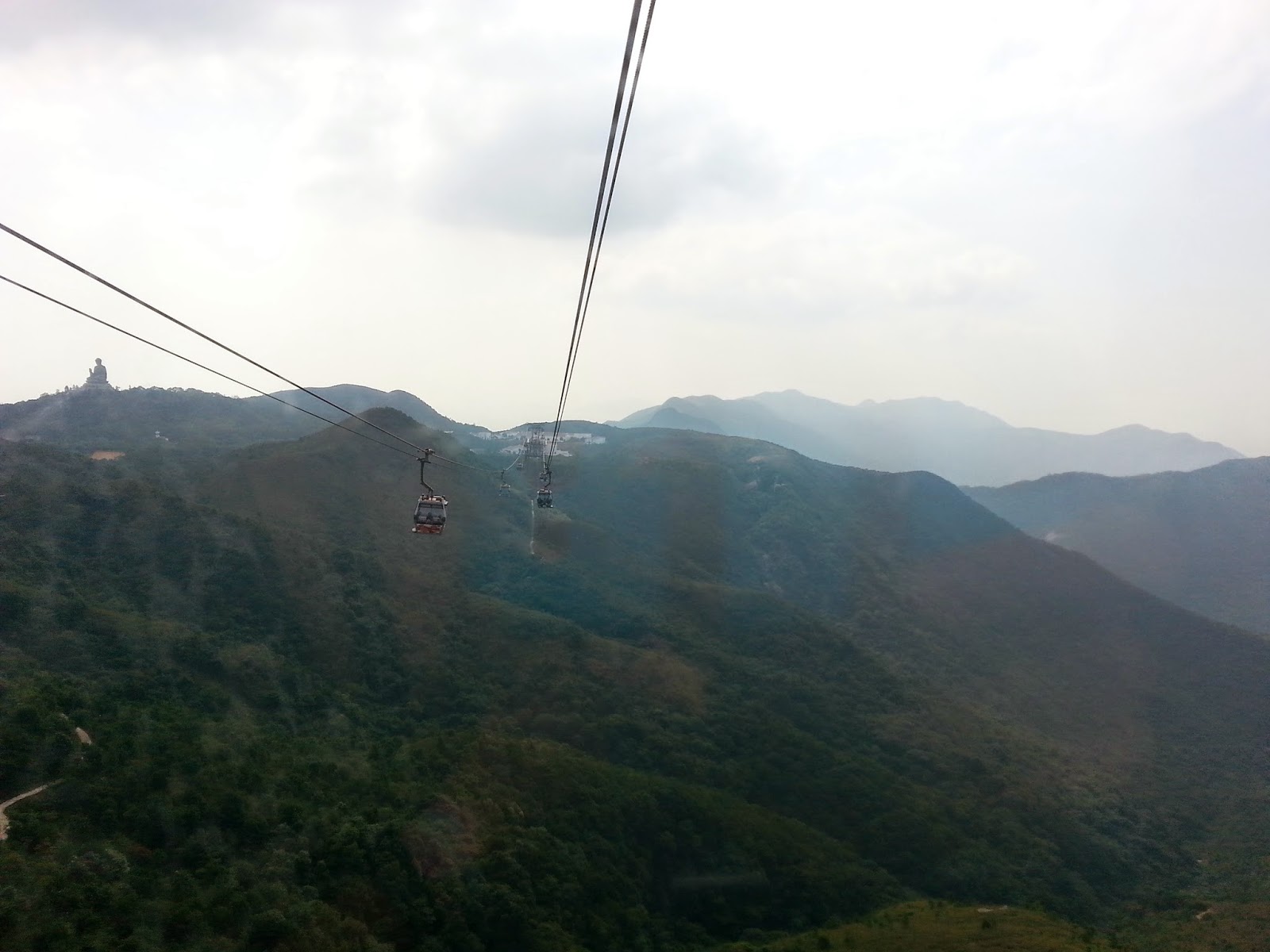 Creio que o passeio no cable car dure aproximadamente 15 minutos. É possível apreciar uma paisagem deslumbrante de Hong Kong. E de repente avistamos o maior buda do mundo, no meio da montanha.