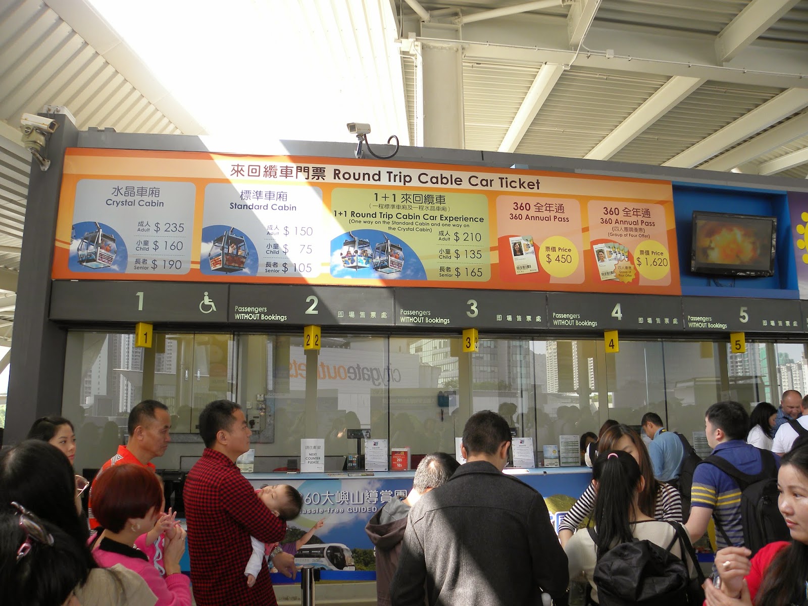 Tinha uma extensa fila para comprar os ingressos do Cable Car Ngong Ping. Existem duas opções: Crystal Cabine Standart Cabin. A primeira tem o piso completamente transparente, que permite uma visão do mar e das montanhas sob seus pés! Optei pela ida na Crystal e volta na Standart. Custou $210 (HK dollar).