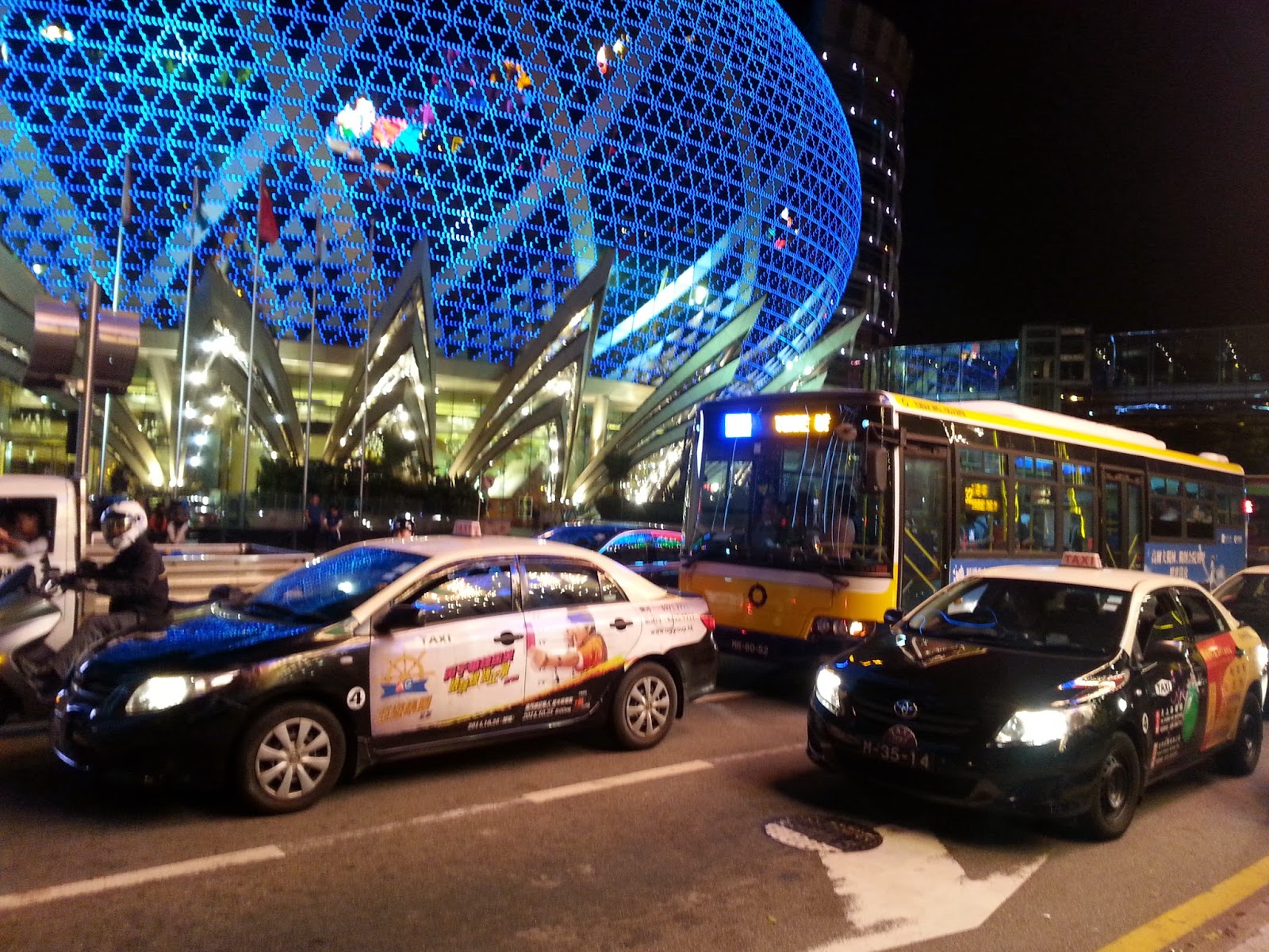 Escolhi um hotel na ilha de Taipa, Regency Hotel, onde está localizado o aeroporto, já que o voo para Bali era na manhã seguinte. Li que ofereciam o serviço de shuttle. Na saída do terminal de ferry, perguntei a algumas pessoas até achar o ponto. Pelo que pude observar, a maioria dos hotéis oferecem transporte. E a grande maioria é cassino!