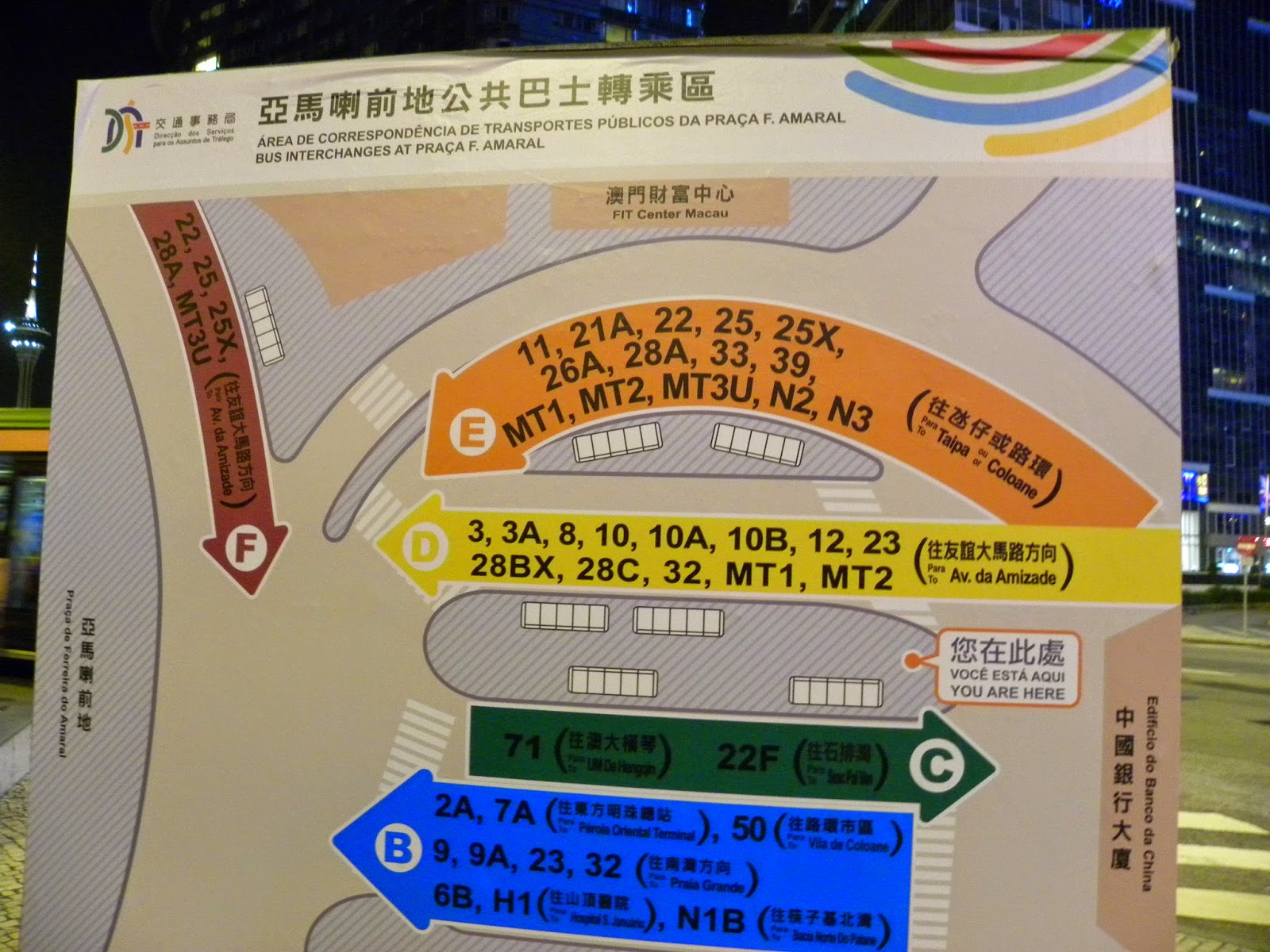 Na recepção, peguei um mapa e me disseram que seria melhor trocar dinheiro no centro. Sem um centavo de pataca no bolso, entrei no último shuttle que deixava no Casino Lisboa. Ele me disse as linhas de ônibus que poderia pegar para voltar ou seguir para o Venetian.