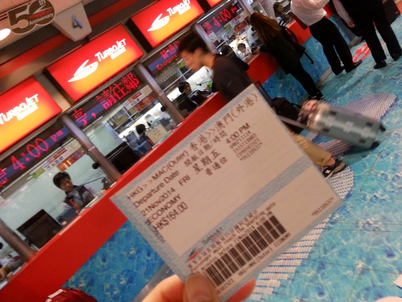 O ferry Hong Kong-Macau custou 164 hk dollars. Embora a passagem estivesse marcada para 16 horas, foi permitido embarcar no ferry que saía às 15:30, pois ainda tinha lugares. O percurso levou 1 hora. O interior do ferry é muito confortável, com poltronas macias e tem banheiro.