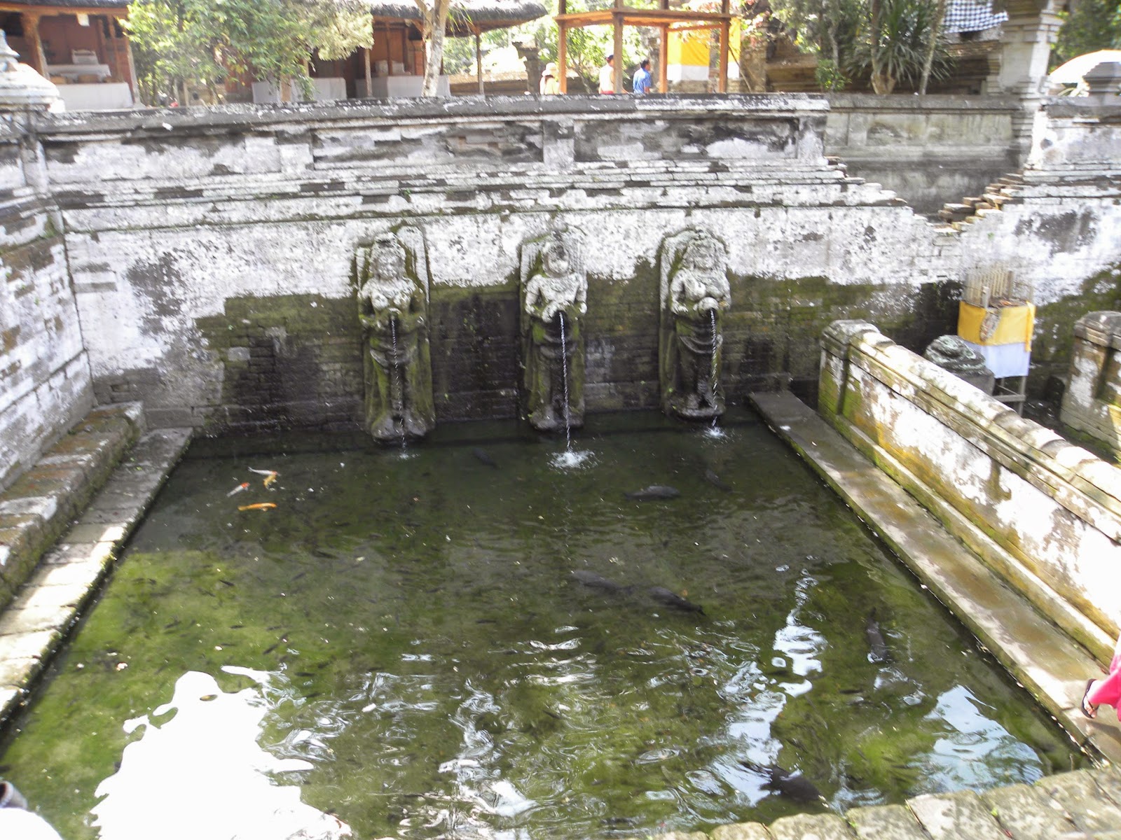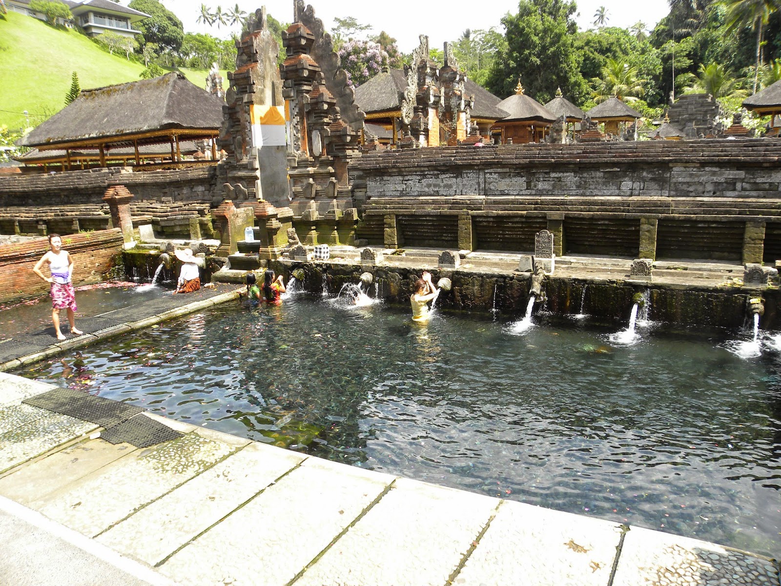 Seguimos em direção a “Tampaksiring”, pequena cidade onde fica localizado o “The Holy Spring Temple”, um templo de águas sagradas. A entrada custa 15.000. Fica localizado num vale entre duas montanhas – na estrada que é caminho para Kintamani. É um lugar para purificar os maus fluidos da vida. Acredita-se que a água proveniente das nascentes é capaz de curar doenças e afastar influências negativas.