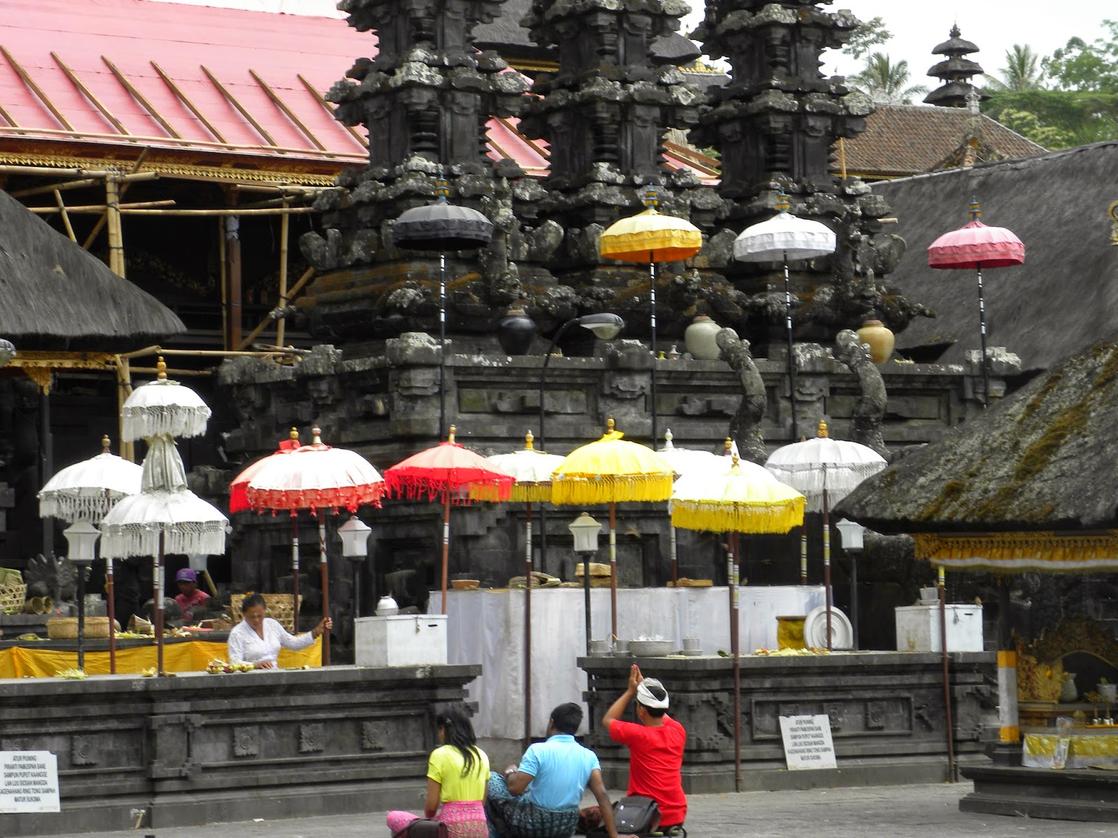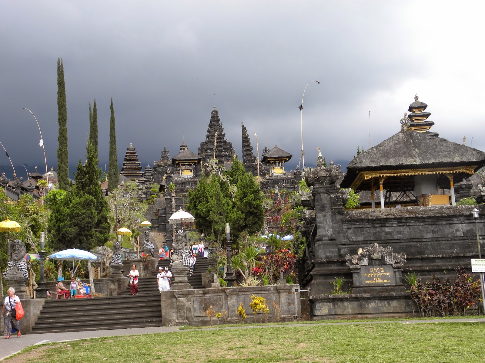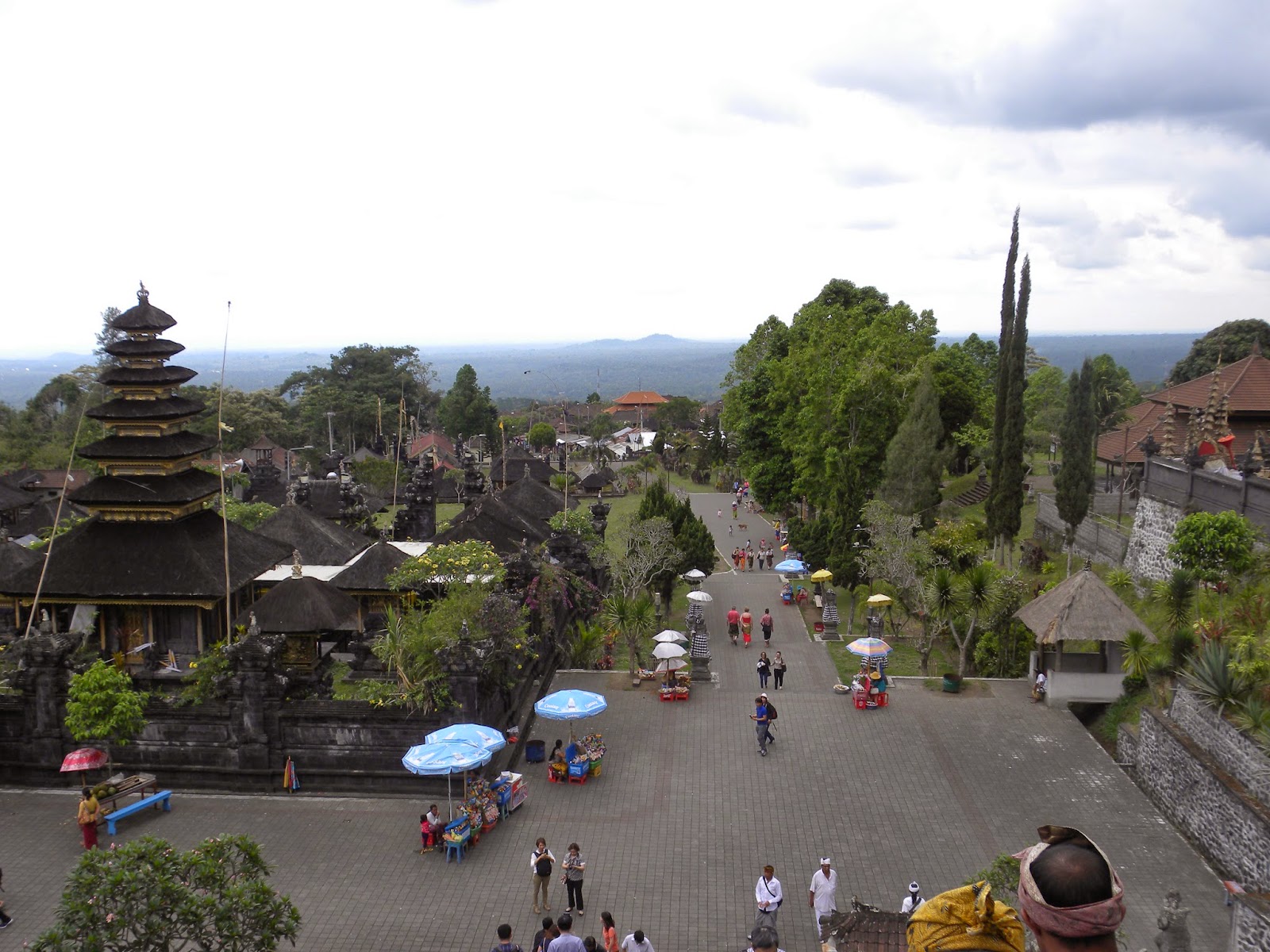 Logo no início fomos avisados pelo motorista que, ao contrário dos demais pontos turísticos em Bali, por algum motivo desconhecido, as pessoas em Besakih eram muito rudes e que tentariam a todo custo cobrar outro valor além do ingresso. O ingresso custou 15.000. Caminhamos e lá estava o templo, com inúmeros homens oferecendo o serviço como guia. Falam que sem guia é impossível subir e visitar o templo. As alemãs quase choraram e voltaram para o carro.