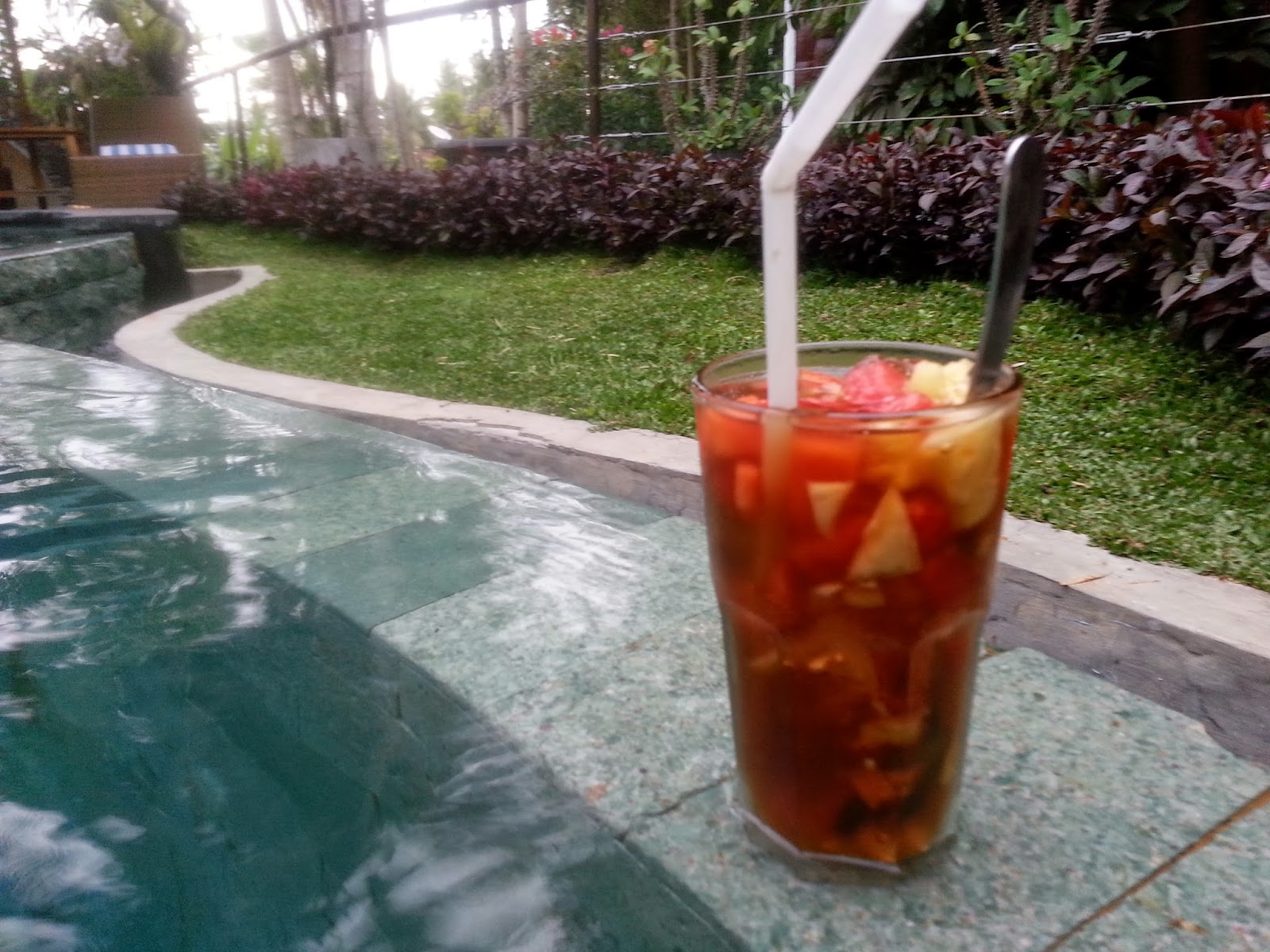Depois de deixar as outras turistas em suas hospedagens, cheguei no hotel morta de fome, mas fui direto para piscina. E mais um mimo: me serviram gratuitamente um chá gelado com frutas! Segui para tomar um bom banho de banheira.