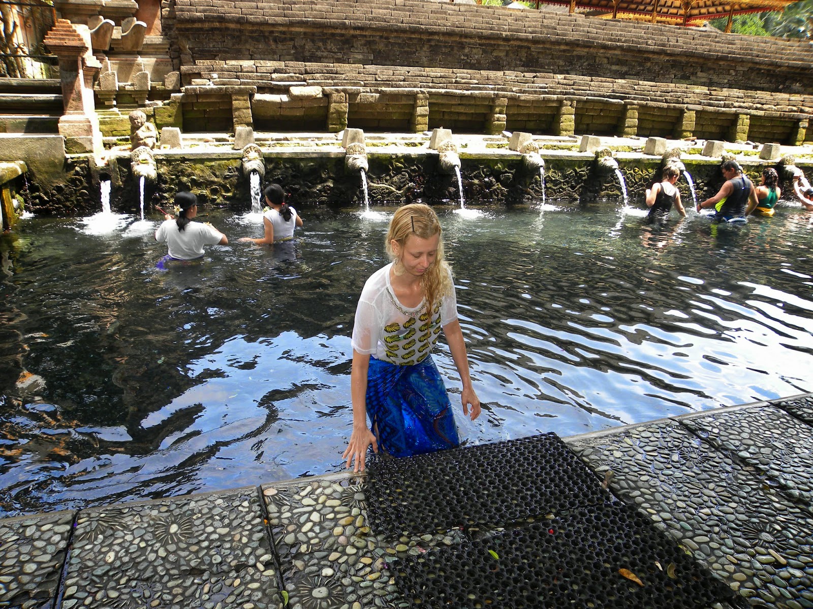 Coloquei o sarongue sobre a calça que usava e estava de biquíni. Após visitar as construções do templo, segui para a enorme piscina sagrada. Pedi a companheira de tour para ficar com minha bolsa, dinheiro, e tirei a calça sob o sarongue. Dei a câmera e pedi para ser fotografada. Depois tive que seguir para um banheiro, que era pago, embora estivesse muito sujo, consegui me secar e recolocar a calça.