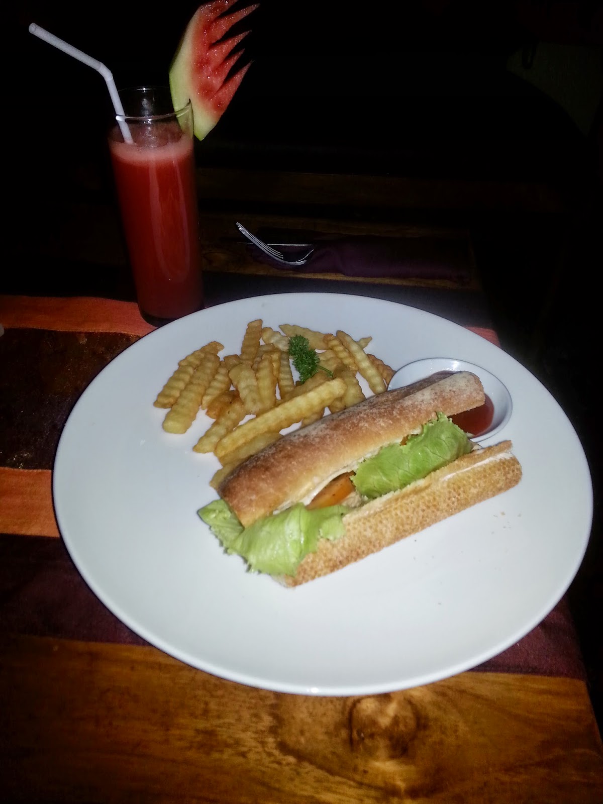 Tinha pensando em ir à cidade para comer, mas estava tão cansada, e já havia agendado com o dono da agência outro passeio para o dia seguinte bem cedo, então, decidi comer no hotel. Ao abrir o menu fiquei muito surpresa, o valor era ínfimo! Pedi um sanduíche de atum e um suco de melancia. Outra surpresa: o lanche era maravilhoso. Um dos melhores que já comi na vida. E foi servido no quarto.
