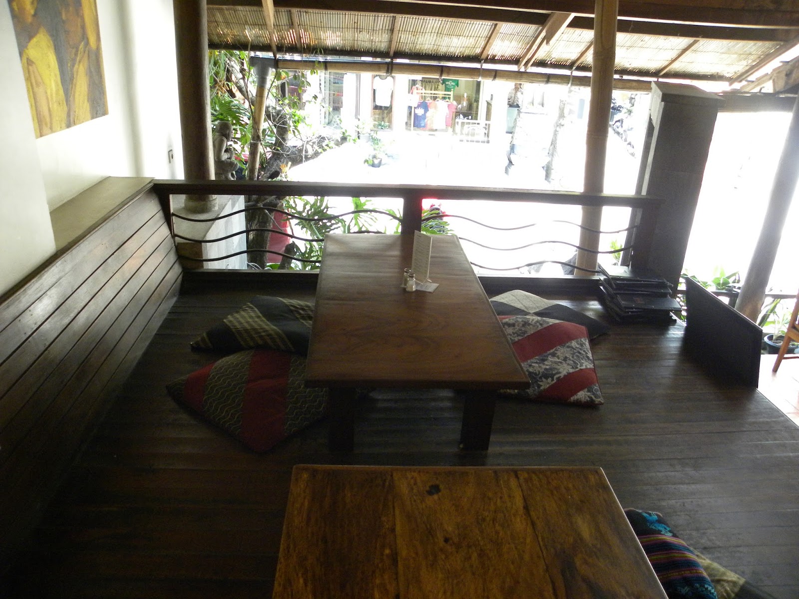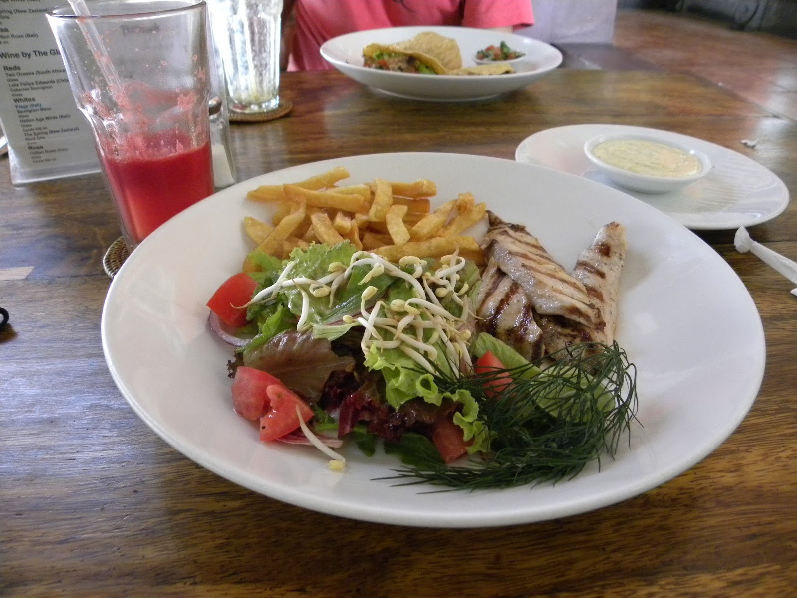 Depois do sofrimento com a culinária chinesa, felizmente cheguei a Ubud, embora não tenha comido o famoso arroz, base da alimentação balinesa, entrei no restaurante, que fica no fim do Ubud Market e próximo a um campo de futebol, Tutmak Restaurant. Encontrará um ambiente delicioso, bons preços e wi-fi grátis. Pedi um peixe grelhado, que vinha com um molho delicioso, batatas e salada. E, para acompanhar, um suco de melancia e uma água de coco (chamam de suco de coco). Toda a refeição saiu por 20 reais!