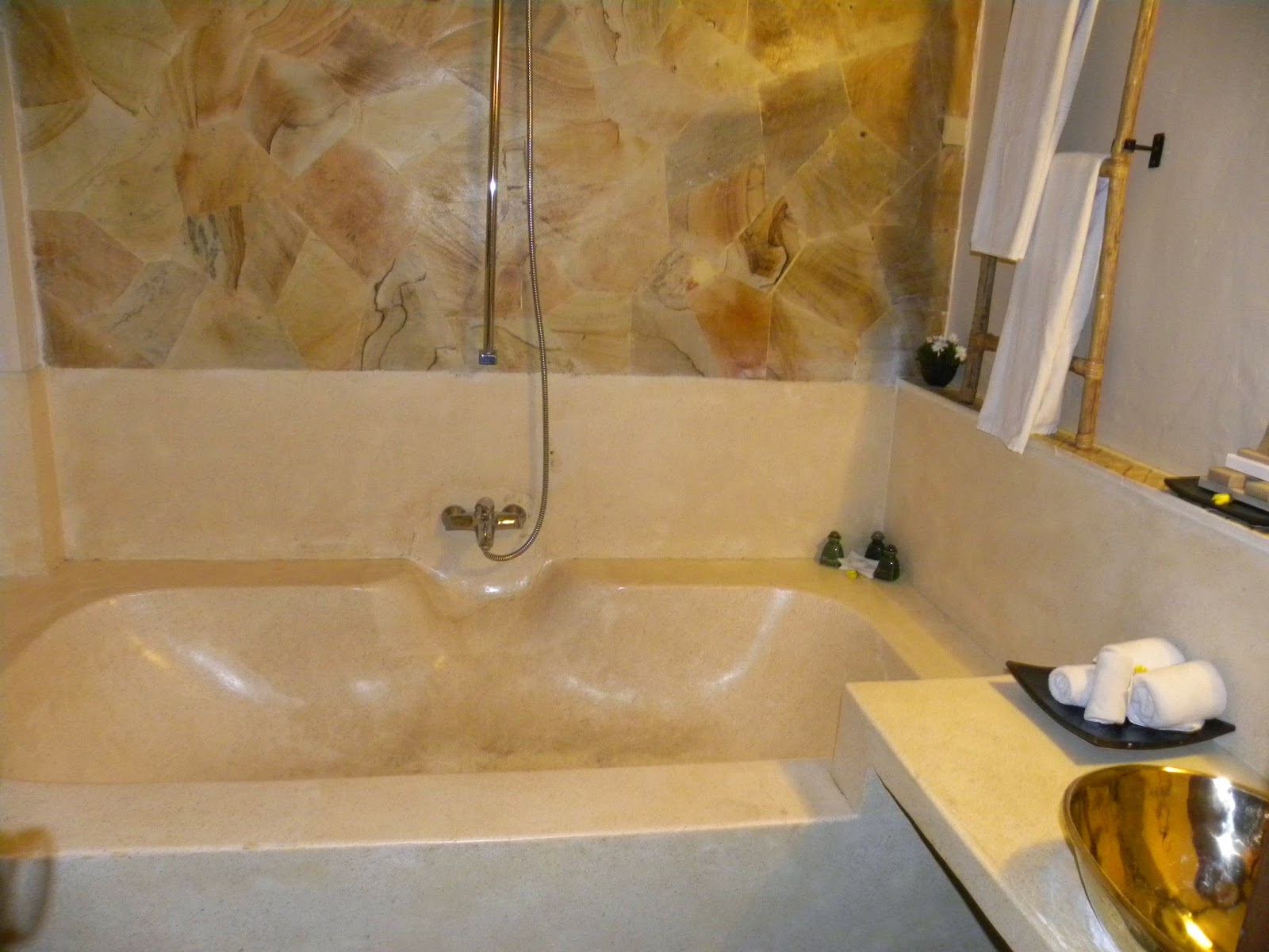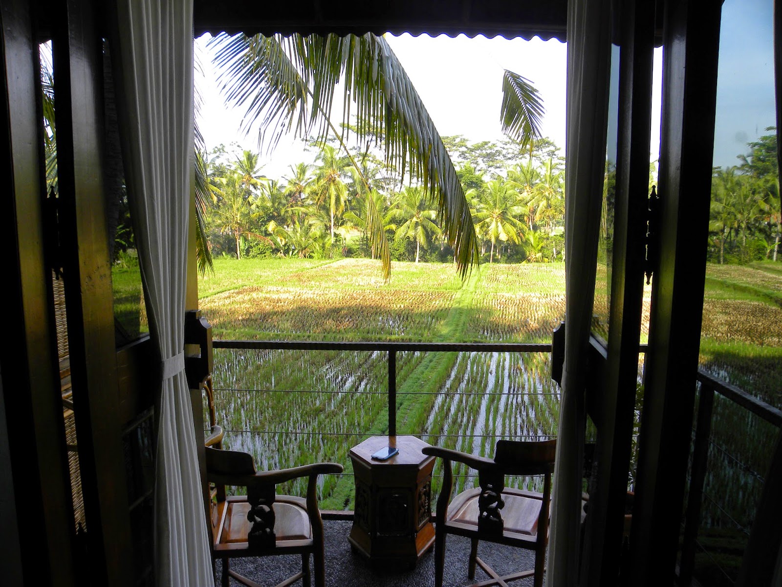 É comum no sudeste asiático receberem o hóspede com um suco de boas-vindas e lá não foi diferente. Ficamos no segundo andar, com quartos imensos, com vista para a plantação de arroz, camas confortáveis, banheira, playstation, frutas. O restaurante do hotel era lindo. A piscina pequena, mas ótima para se refrescar após um dia inteiro andando.