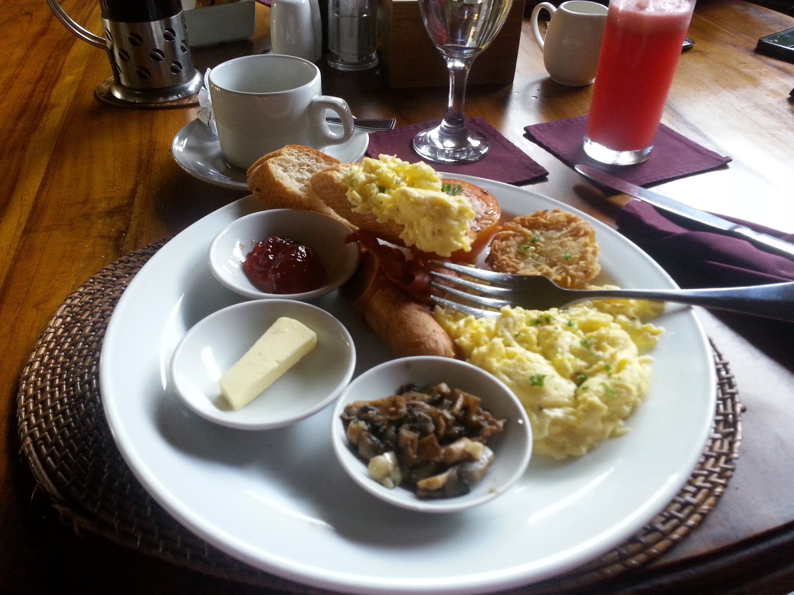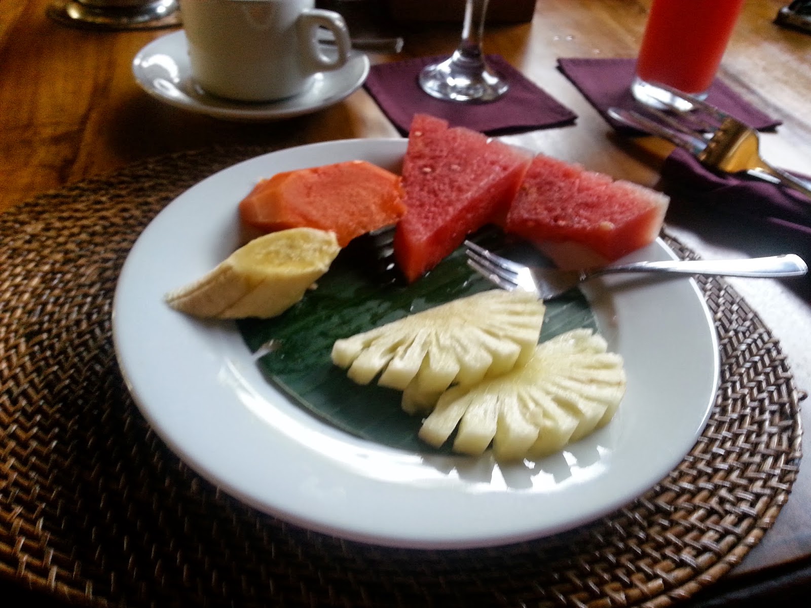 No dia seguinte, degustamos o excelente café da manha do hotel, que é pré-agendado, você olha o menu e escolhe o que quer comer, se um café da manhã típico de Bali ou um café da manhã mais europeu. Existem diversas opções. Você escolhe o suco, a bebida quente, como serão os ovos, as frutas. O lado ruim é que não tem como repetir (risos)!
