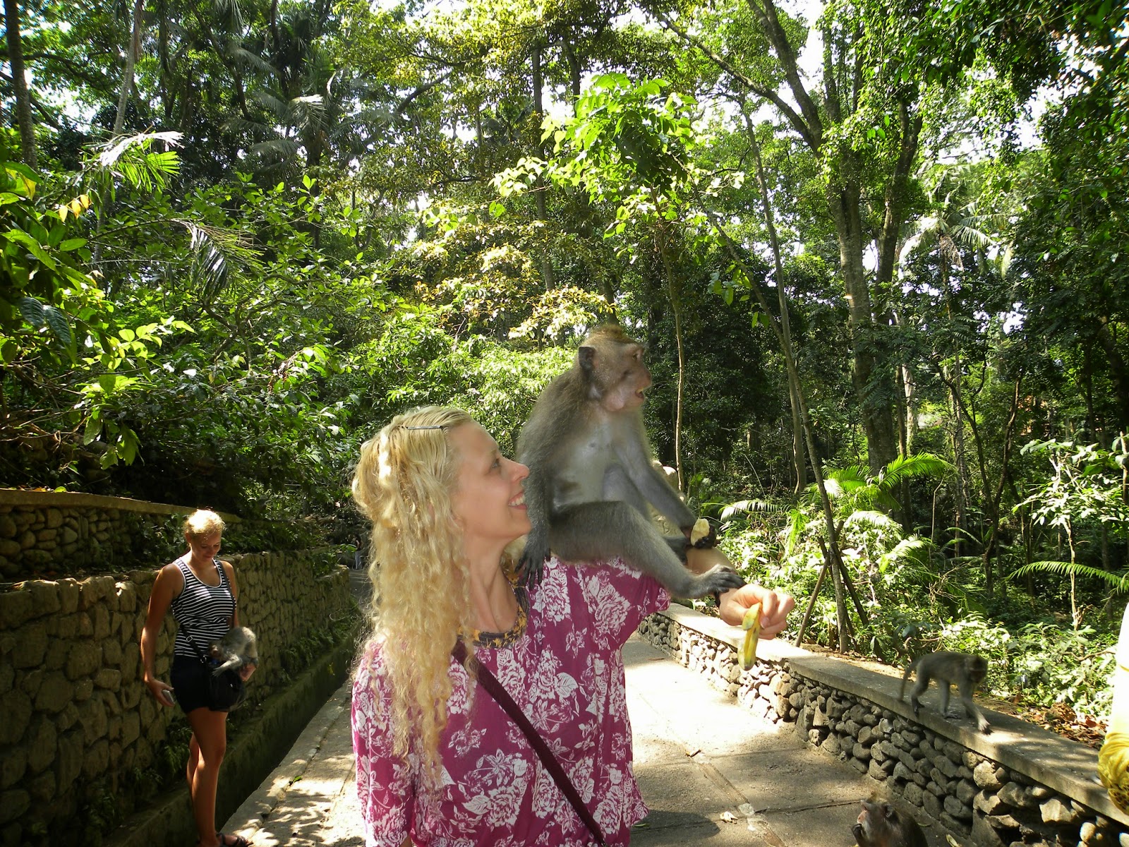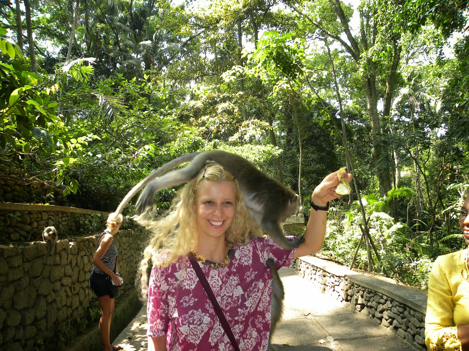Comprei algumas bananas e pedi que a vendedora tirasse as minhas fotos. Ela afastou os macacos gigantes e deixou que apenas os menores subissem em mim. Os macacos surgem por todos os cantos.