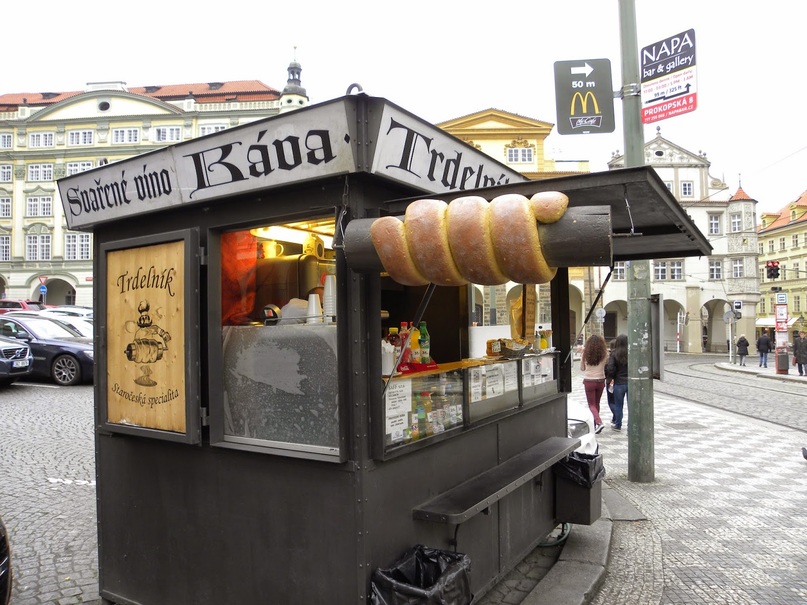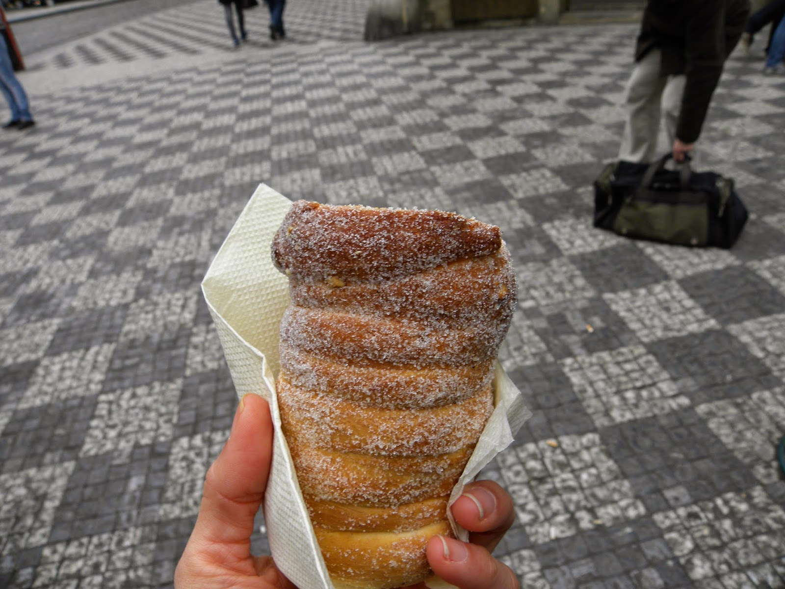 O dia estava frio e aproveitei para experimentar o “trdelnik” (pão com cobertura de açúcar) e o vinho quente.