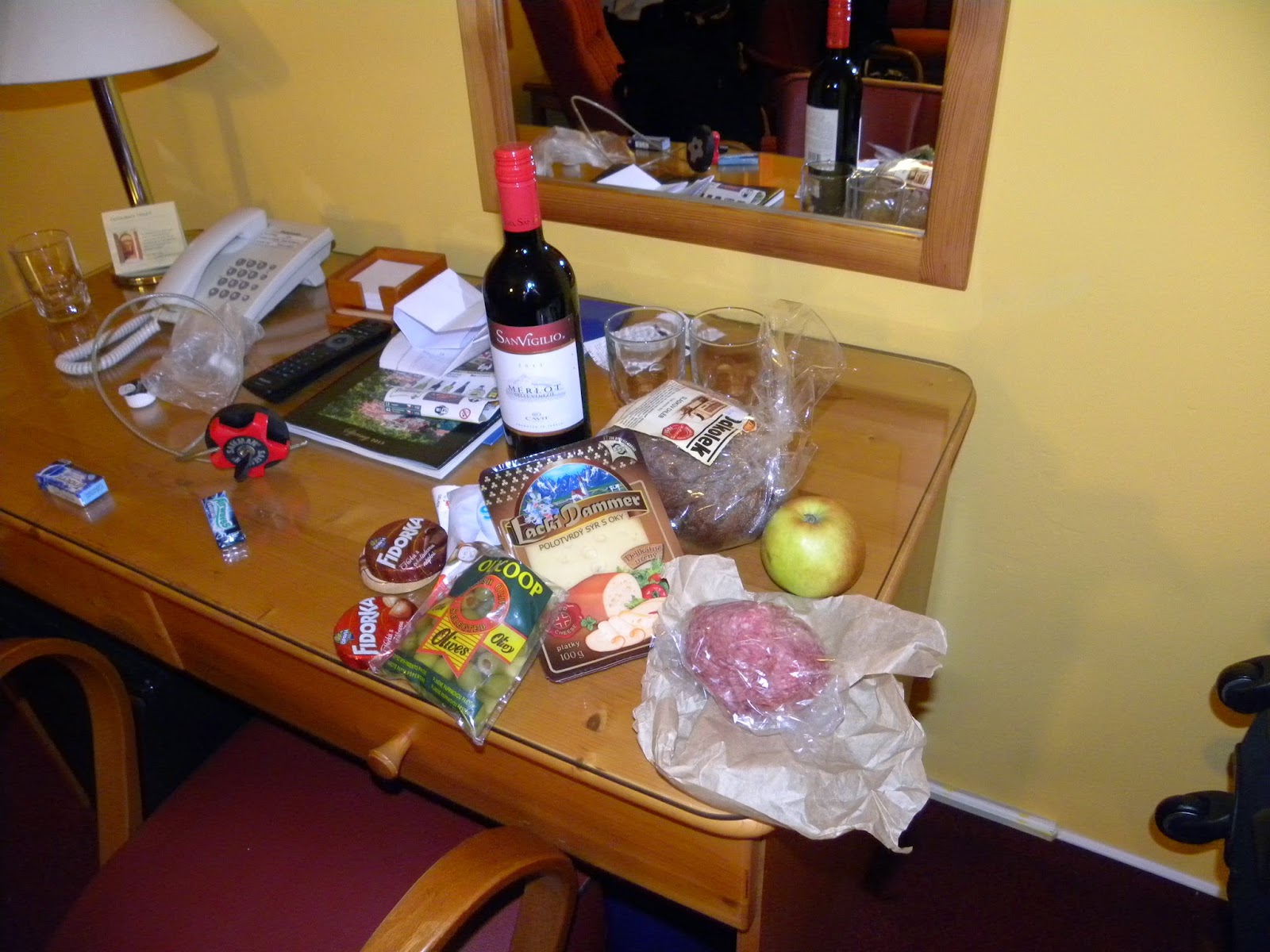 No fim da rua tinha um supermercado e compramos salame, queijo, pão preto, azeitona, vinho e chocolate para levar para o hotel, pois o frio era assustador para uma primavera.