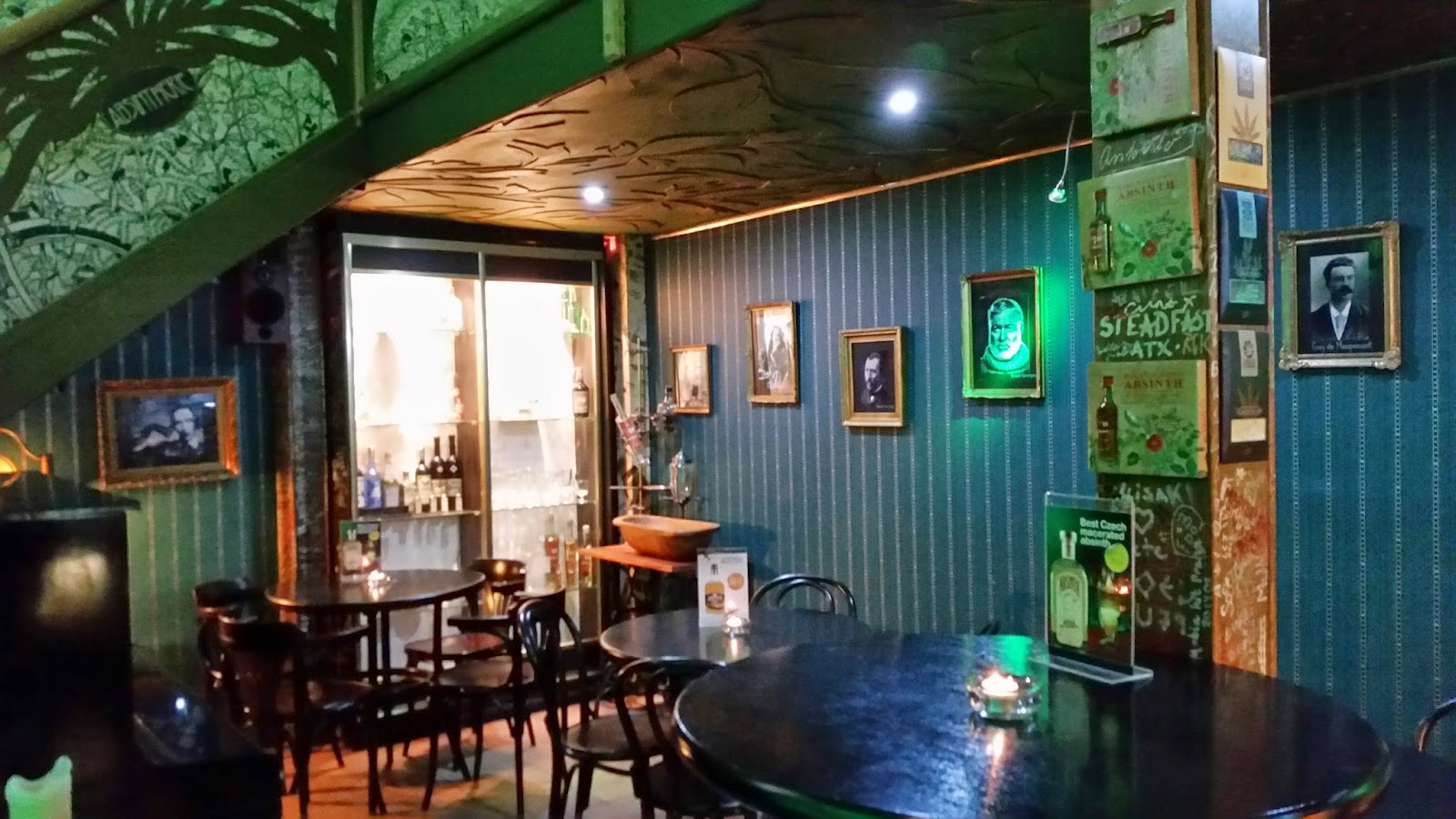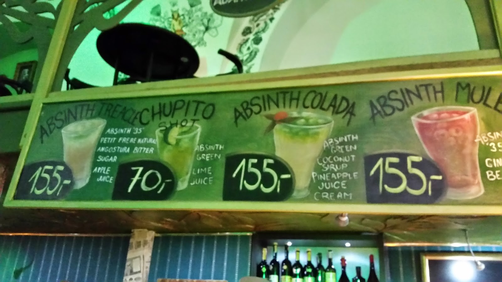 O absinto (também conhecido como “a fada verde”) foi, por muitos anos, uma bebida proibida em razão do suposto efeito alucinógeno advindo da erva losna, mas principalmente por seu teor alcoólico, que pode chegar a 90% (observei no mercado rótulos com 70%, 80%). Foi muito popular na França, embora tenha sido criada na Suíça. No Brasil, a bebida só é permitida se tiver o teor máximo de 54%. Na “Absintherie”, os célebres apreciadores da bebida eram exaltados: Wilde, Van Gogh, Dalí, entre outros. Tinha um menu com várias bebidas feitas com absinto, mas escolhi um tipo de pina colada, que estava muito amargo e detestei. A bebida do meu amigo, feita com maçã, estava uma delícia, bem doce e suave.