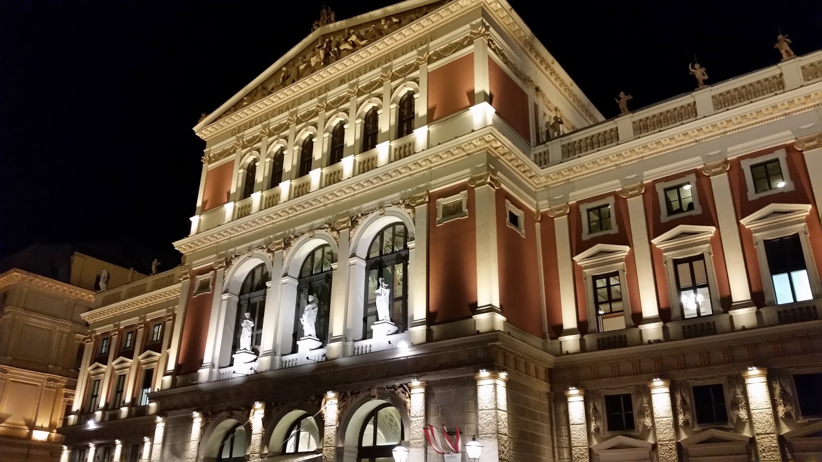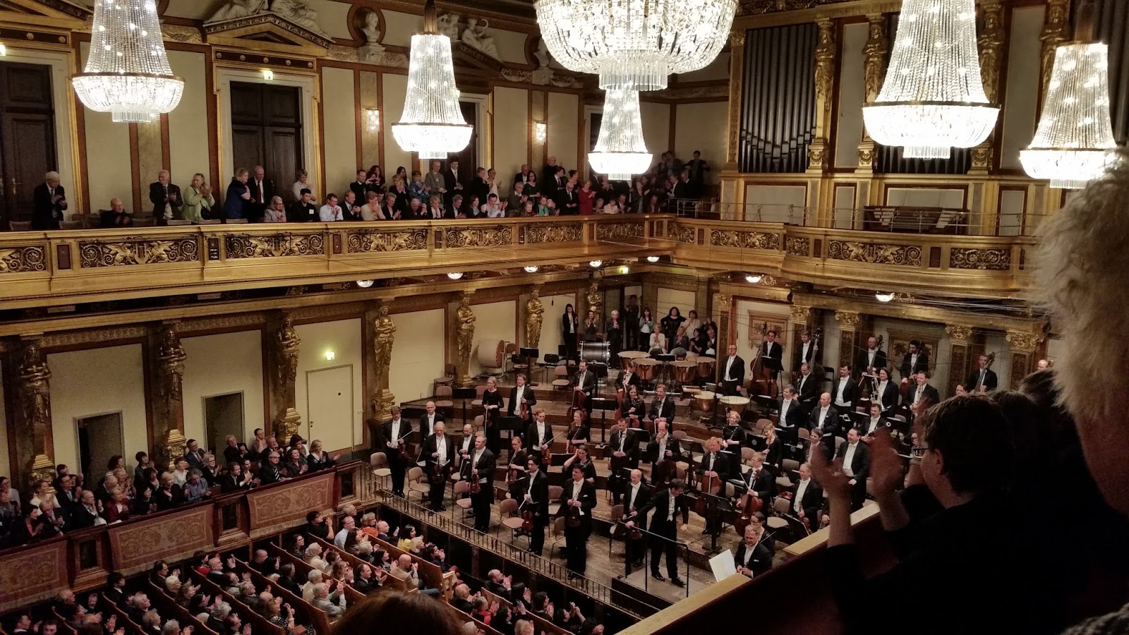 Saindo dali, seguimos para a estação, que tem uma praça de alimentação. Comemos e trocamos os tíquetes de trem para Budapeste (embora seja comprado na internet, o comprovante deve ser trocado por um bilhete na máquina). Depois, caminhamos em direção ao hotel. Queríamos assistir um concerto no Musikverein ou Wiener Staatsoper (Ópera Estatal de Viena). Consultei o google e só restava uma opção: concerto às 19:30 no Musikverein. Saímos do hotel por volta das 19:10 e tentaríamos o impossível. Pegamos o metrô e saímos na frente da Ópera (tinha um enorme telão instalado no edifício, que permitia ao transeunte assistir na calçada), corremos e atravessamos umas 3 ruas. Às 19:26 entrei na bilheteria e tinha ingresso! De repente, nos deparamos com a elegância das pessoas em nossa volta: homens de terno e mulheres de longo. Nós estávamos de camiseta, tênis e calça jeans! Pior, corremos para encontrar os nossos lugares e tivemos que deixar os casacos na chapelaria. Meu amigo queria morrer de tanta vergonha! ahahahah