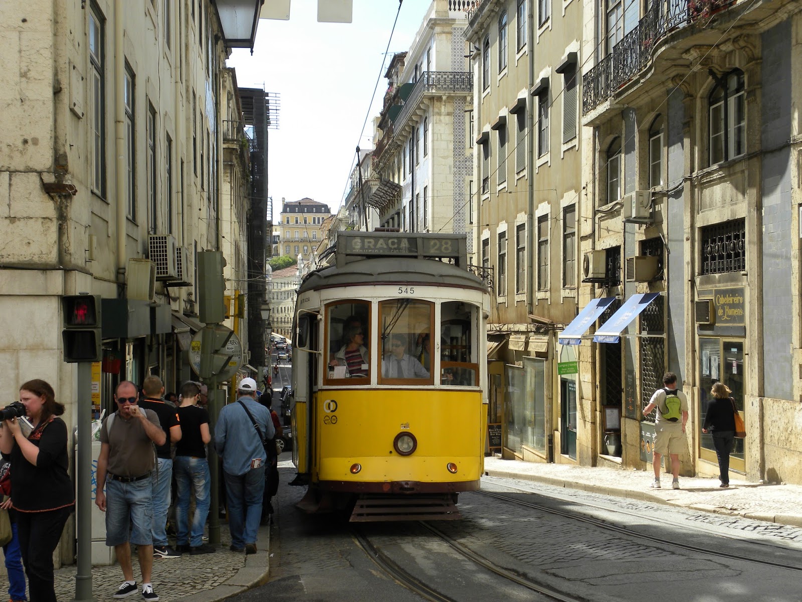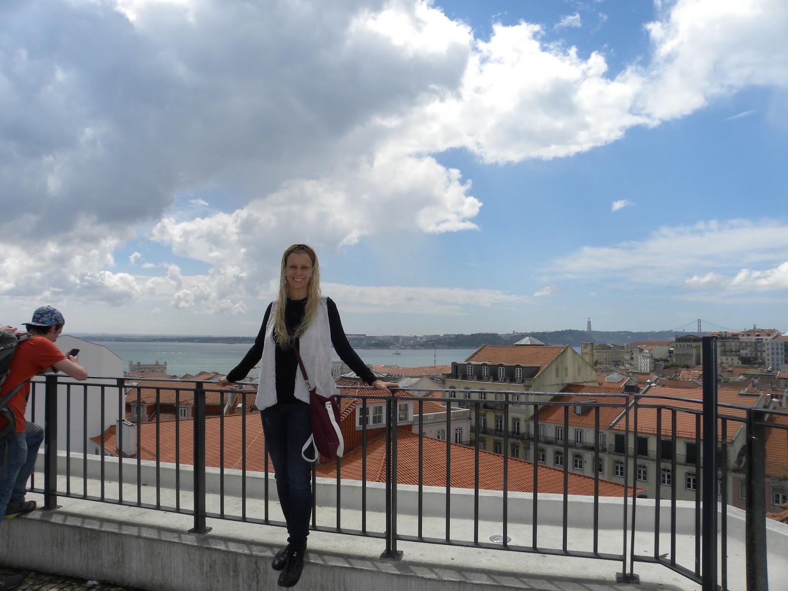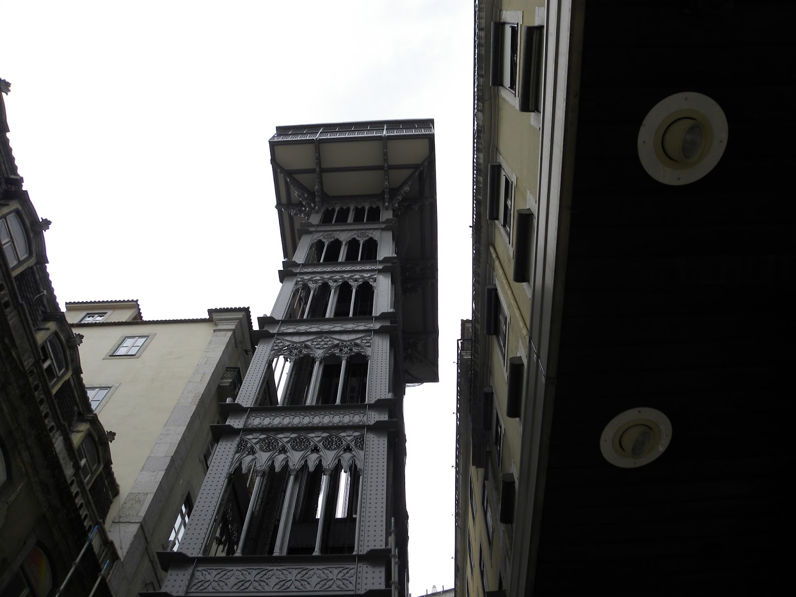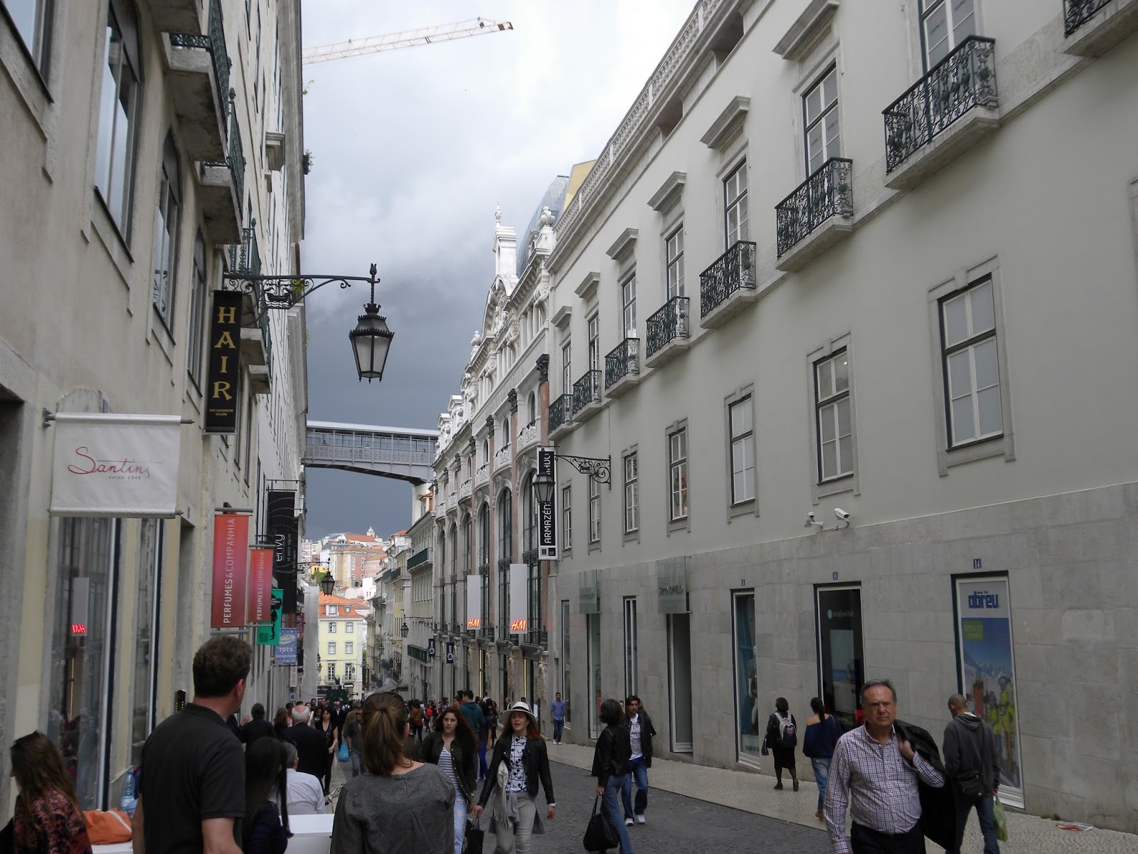 Depois resolvemos pagar (o bilhete dá o direito de subir e descer, além de apreciar a paisagem num mirante) para subir o elevador de Santa Justa e caiu um temporal. Saímos correndo no Bairro Alto em direção ao Convento do Carmo, que estava fechado, em razão de reformas. Tentamos nos abrigar na praça, pois não tínhamos levado guarda-chuva, tampouco passava táxi. Quando a chuva diminuiu, decidimos descer a ladeira e, quando vimos, estávamos muito próximo do apartamento.
