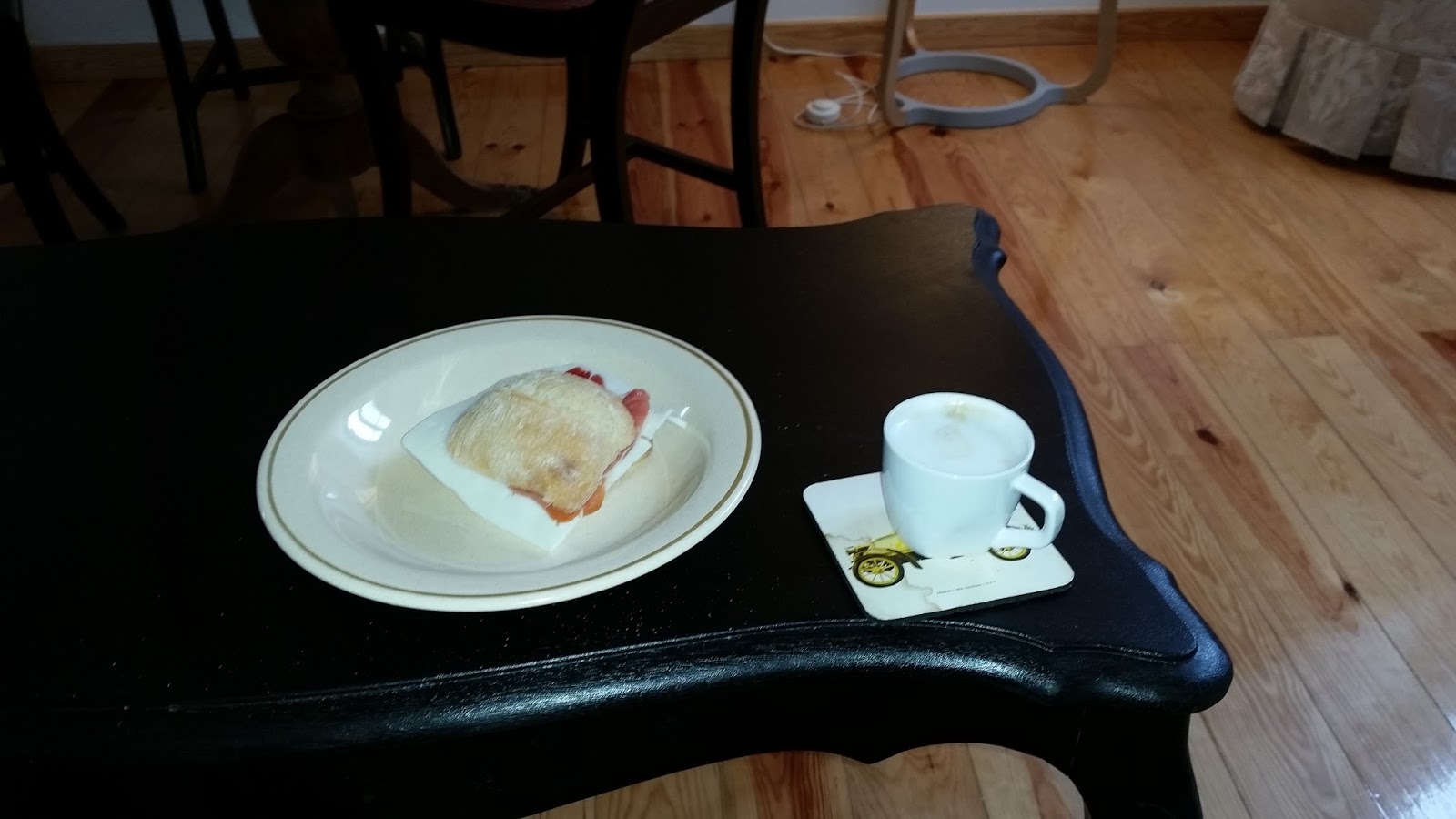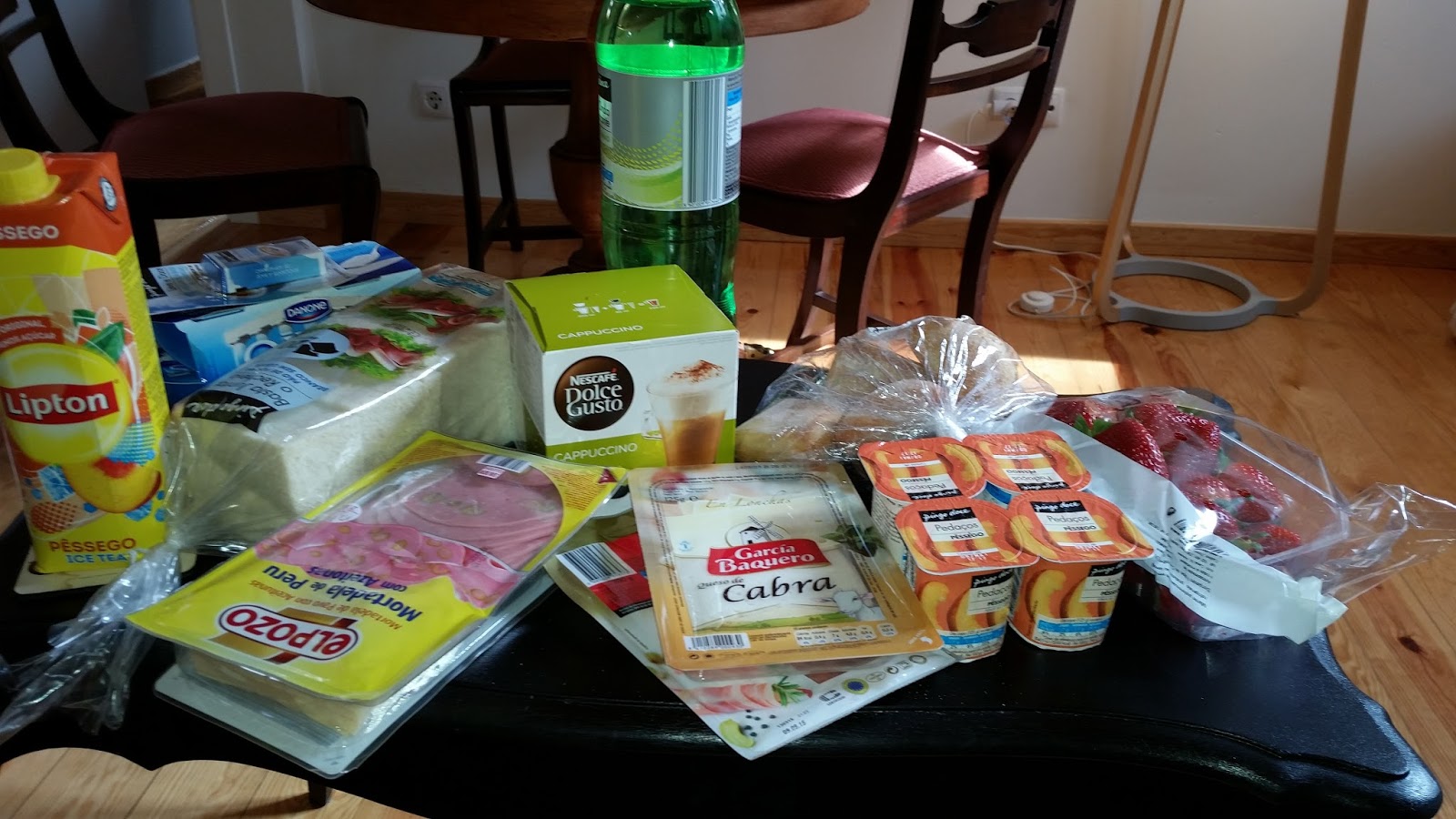 Comprei presunto ibérico, queijo de cabra, cápsulas de cappuccino, pois havia uma dolce gusto no apartamento, chá, suco, iogurte, pão e morango.