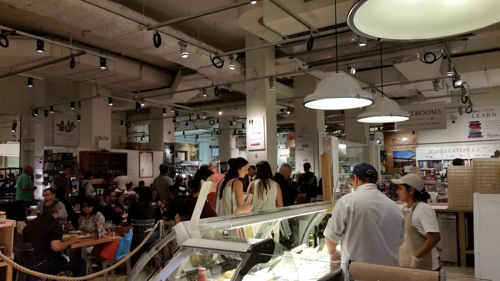 Retornamos ao hotel, pois tínhamos agendado um jantar no Eataly com Carol e Wendel, amigos do Rio que também estavam em NYC para assistir ao show. Chegamos no restaurante e tivemos que esperar cerca de uma hora para podermos sentar. O empresário da Madonna, Guy Oseary, passou ao nosso lado. Ouvia falar do restaurante, principalmente após a comoção na inauguração da filial paulista. O restaurante tem várias seções, de peixes, massas, sorvetes e cada produto só pode ser pago no próprio setor. Primeiro comemos focaccia e depois optamos por massa com vinho. O preço não foi absurdo, apesar de odiar serviços que tenham gorjeta de 20% (costume nos EUA, exceto para lanchonetes “fast-food”).