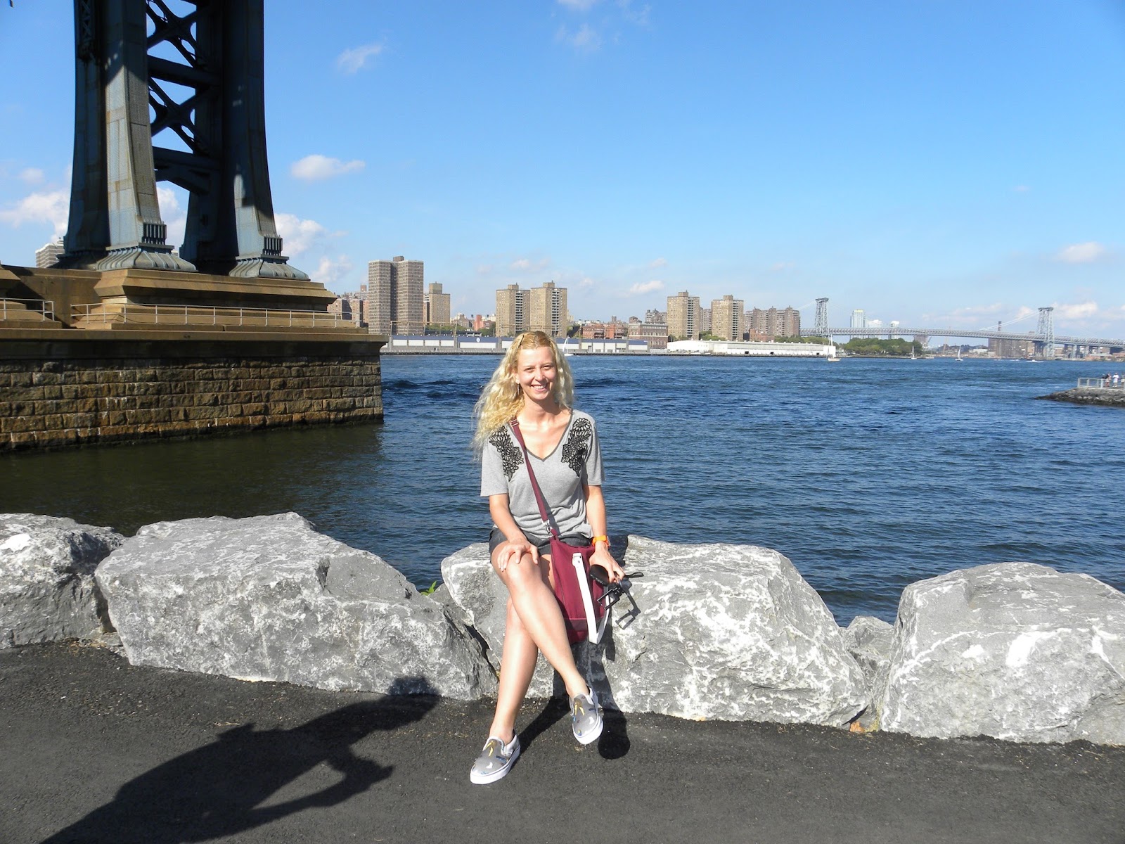 Dumbo (down under the manhattan bridge overpass), região no Brooklyn próxima às duas pontes, é um lugar agradável, com prédios altos, ruas largas e muito verde. Queria conhecer melhor o distrito, mas estava faminta e ainda tinha que fazer a travessia. Entrei no “Front Street Pizza” e pedi 1 fatia de pizza, 1 focaccia e 1 limonada. Além do lanche fresco e saboroso, o valor era inferior ao cobrado em Manhattan. Ali, pela primeira vez, algo me incomodou: um homem com uma enorme bolsa, que fazia sua refeição, falou comigo por 2 vezes, mas parecia um gângster (juízo de valor, ok) e me olhava de forma muito estranha.