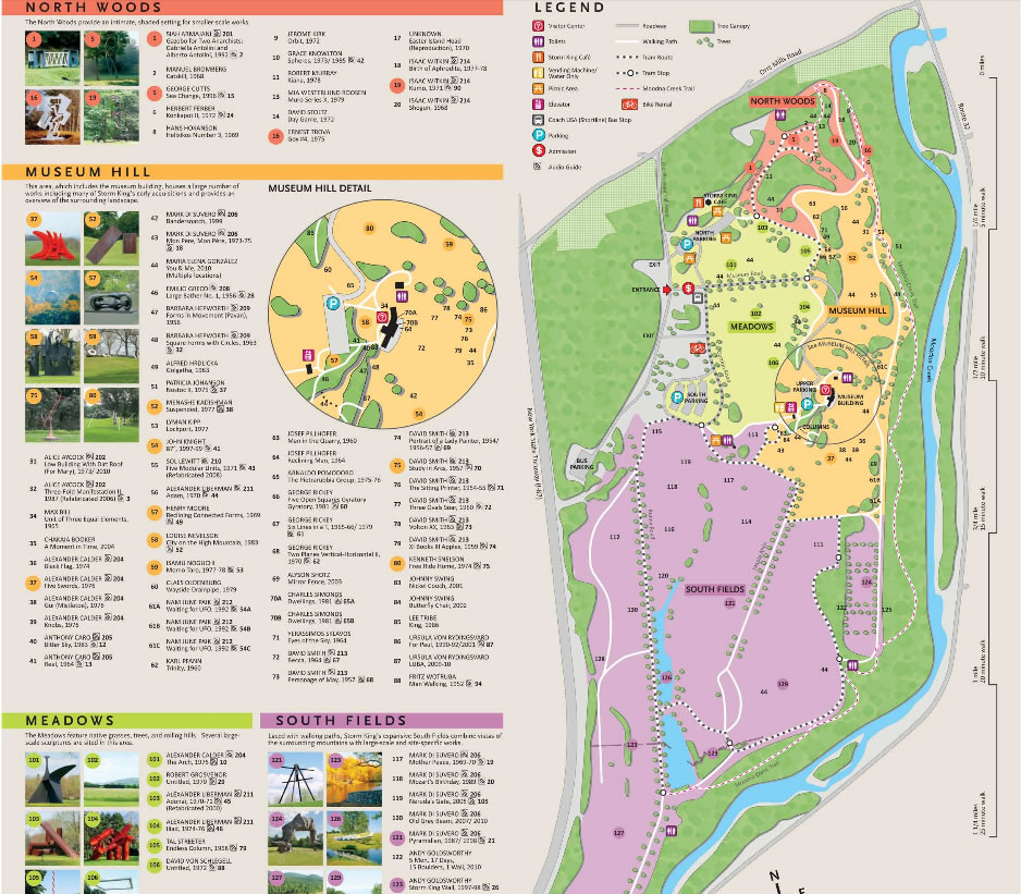 O parque tem mais de 500 acres de extensão e oferece três opções para visitar as esculturas: caminhar, alugar uma bicicleta ($16 por 2h) ou esperar o carrinho gratuito que para em alguns pontos específicos. Iniciamos a visita caminhando, mas o sol era escaldante, depois preferimos aguardar o carrinho, que tem um áudio explicativo acerca das obras.