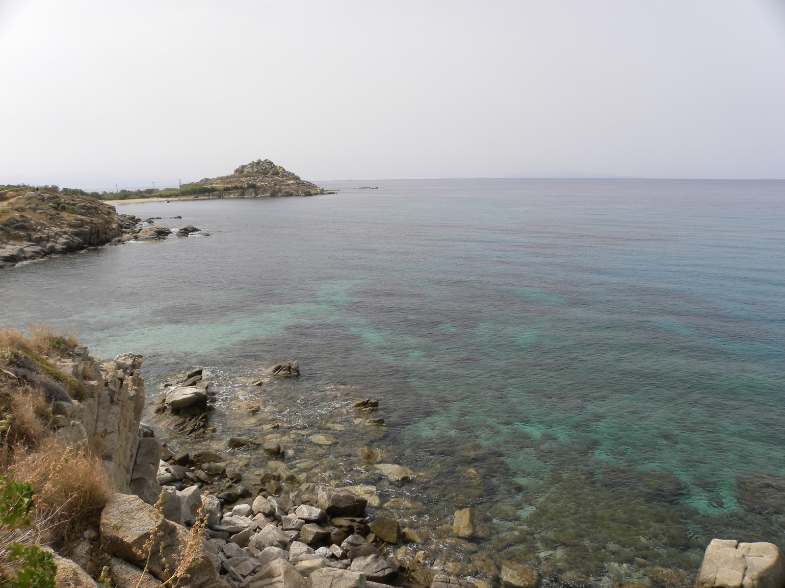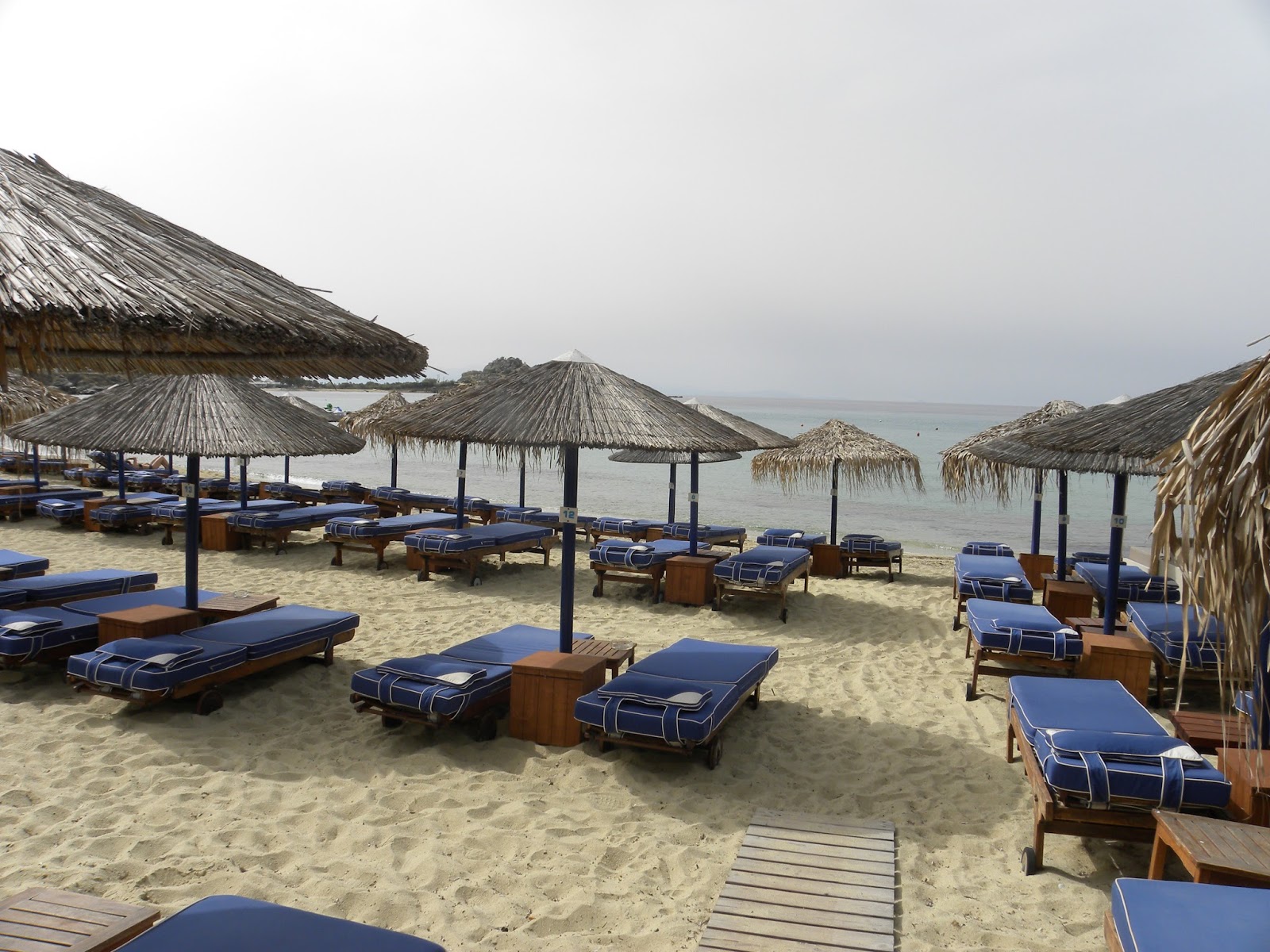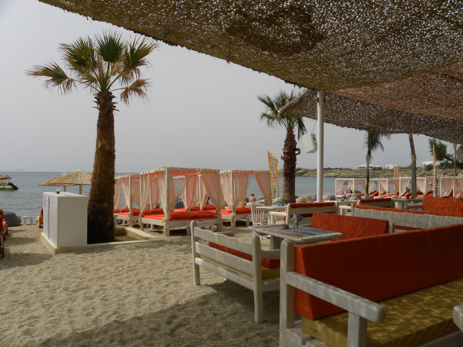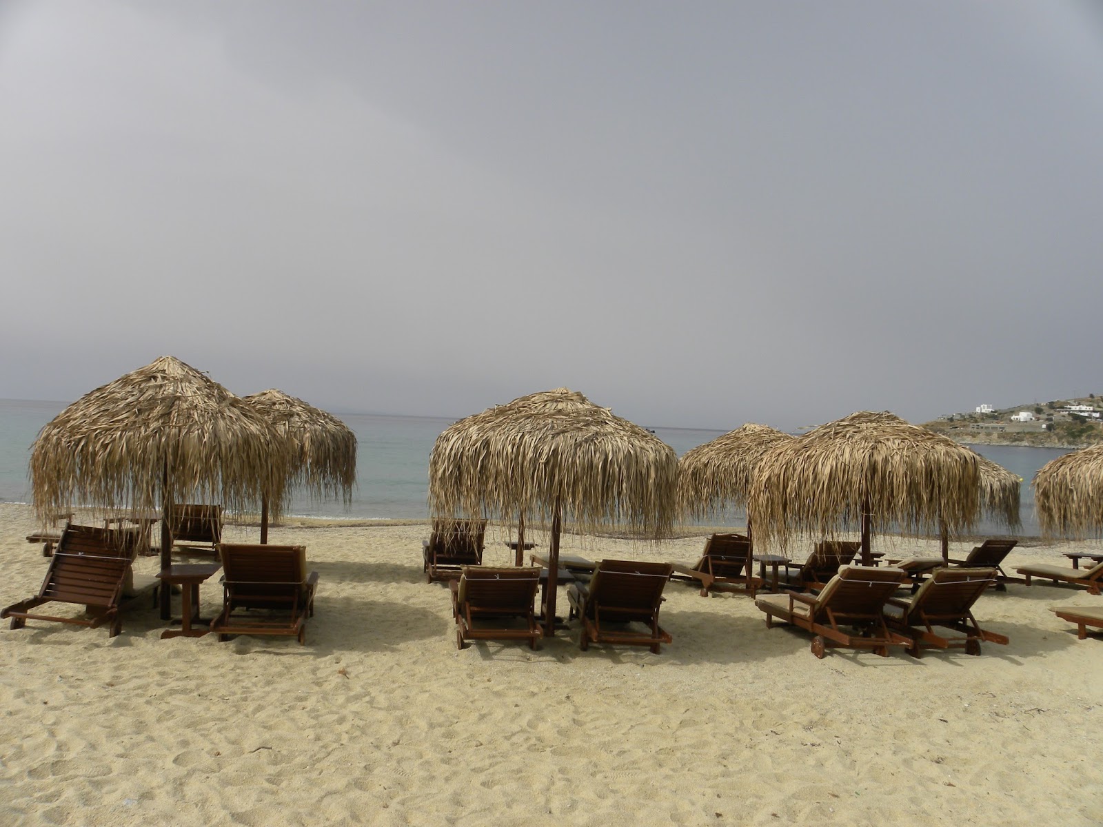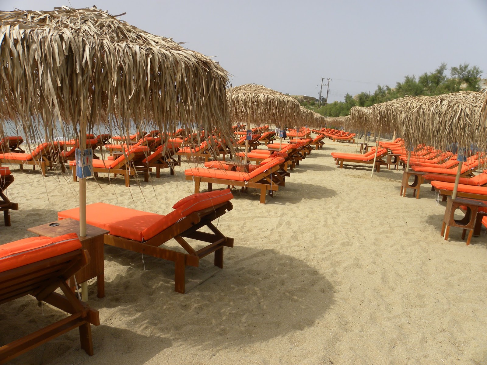 No quarto dia, acordei cedo para visitar a praia de Ornos. Na verdade, queria visitar Elia, mas só tinha um horário de ônibus, que saía ao meio-dia e só retornaria às 17h. O ponto ficava na frente do hotel, mas como acordo cedo quando viajo, optei por Ornos. Uma das coisas que me chamaram atenção é que nessa praia havia sofás e espreguiçadeiras até a água, restando pouco espaço para quem não quer pagar 20 euros para se esticar. Andei até o fim da praia, onde ainda existem 4 casas. Ali na frente a maioria dos turistas repousavam sobre suas toalhas.