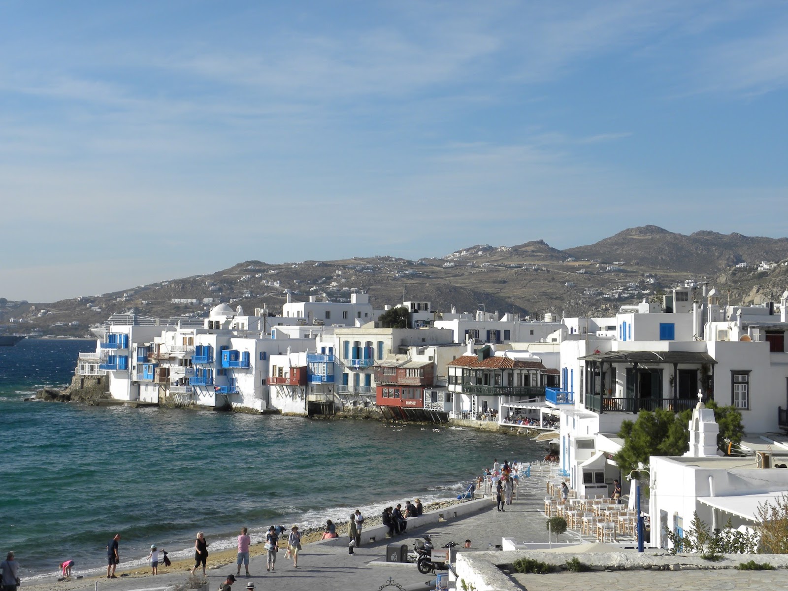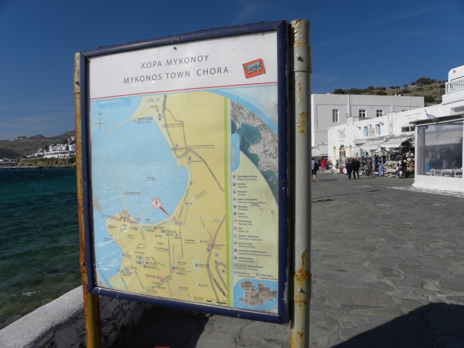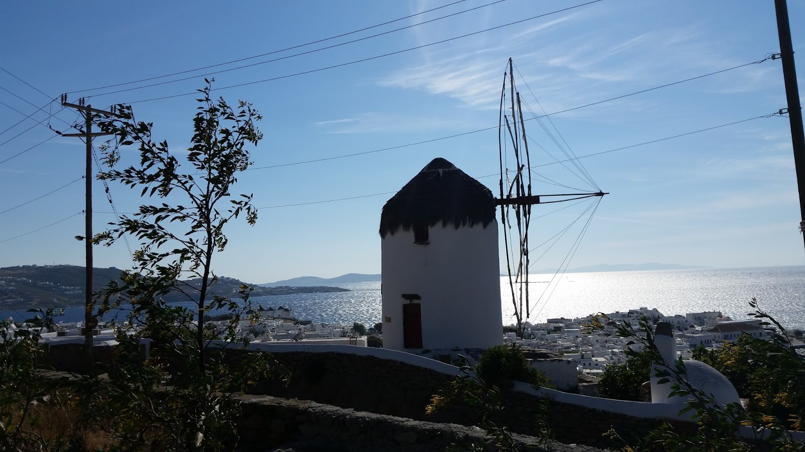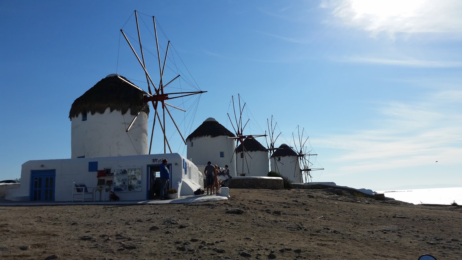 Após um banho rápido, seguimos até a ladeira – caminho para o centro, que fica ao lado de um Posto Shell. Em 10 minutos cheguei no centro de Mykonos, que é um local encantador. Chora é pitoresca, com casinhas brancas, ruas de pedra, mar transparente com areia branquinha e inúmeras igrejas. São vários restaurantes, lojinhas, mercadinhos. Segui pelas vielas (só passam pedestres na maioria das ruas) até Little Venice, que é o local mais elegante da ilha, com algumas casas antigas construídas de forma precária nas margens do mar. Depois das merecidas fotos, uma subida até os moinhos de vento.